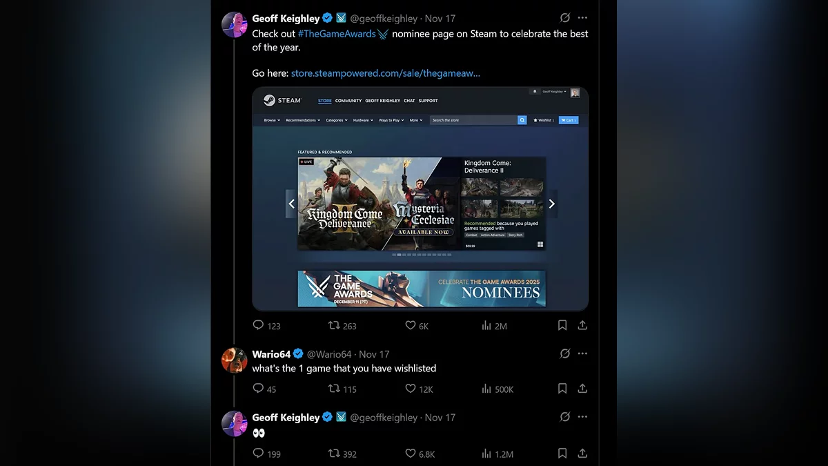 Естественно, интернет сделал то, что умеет лучше всего: превратил это в заговор. Под твитом появился вопрос от инсайдера Wario64 — «Что за одна игра у тебя в вишлисте?» — и сотни фанатов уверенно предположили, что это Half-Life 3. Кили подлил масла в огонь, ответив эмодзи с глазами — и слухи моментально вышли из-под контроля.