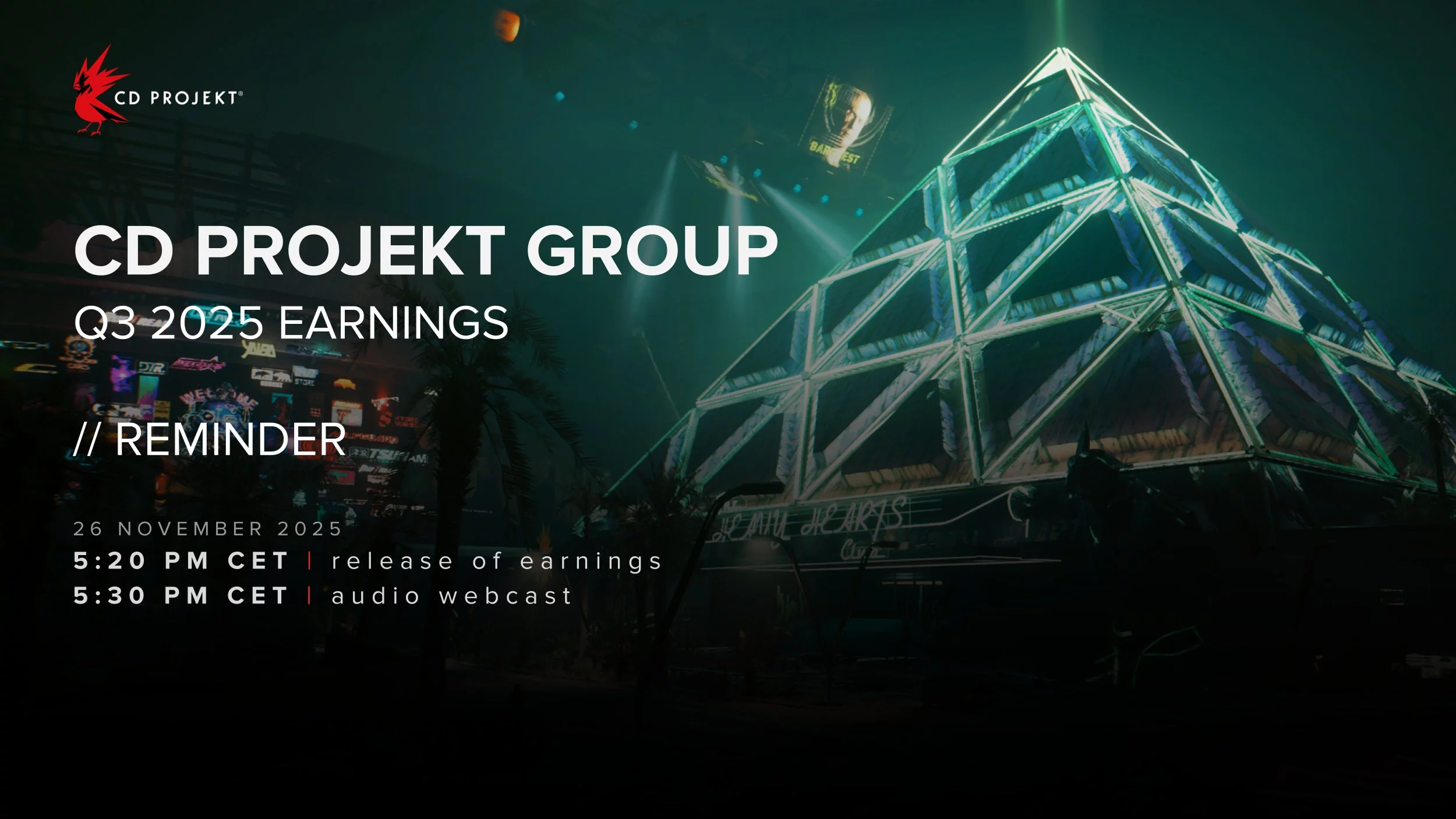 Компания CD Projekt сообщило дату публикации следующего финансового отчёта за третий квартал 2025 года. Показателями обещают поделиться 26 ноября в 19:30 по МСК.
