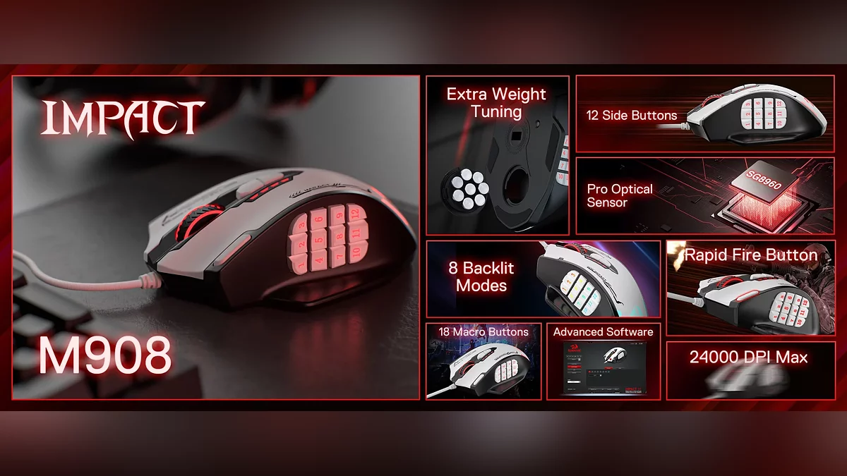 Компания Redragon пополнила свой ассортимент мышек новой проводной моделью Impact M908 SE. Разработка ориентирована в первую очередь на поклонников массовых многопользовательских онлайн-игр (MMO), где важно быстрое использование множества способностей.