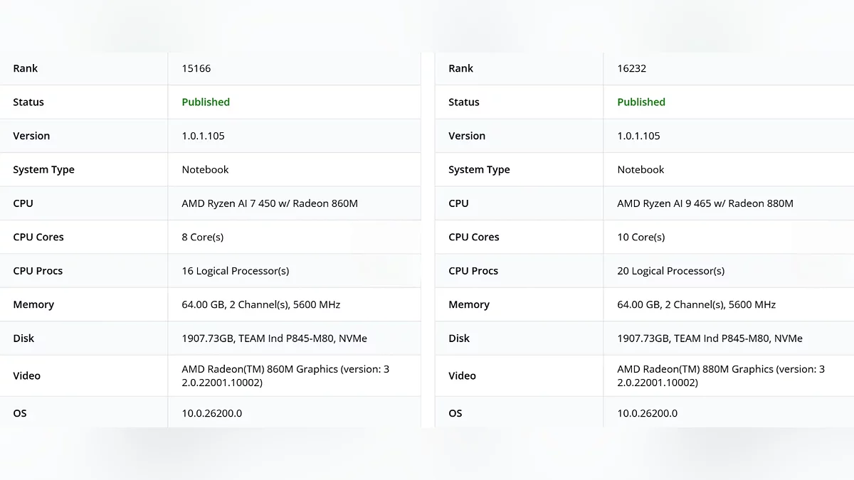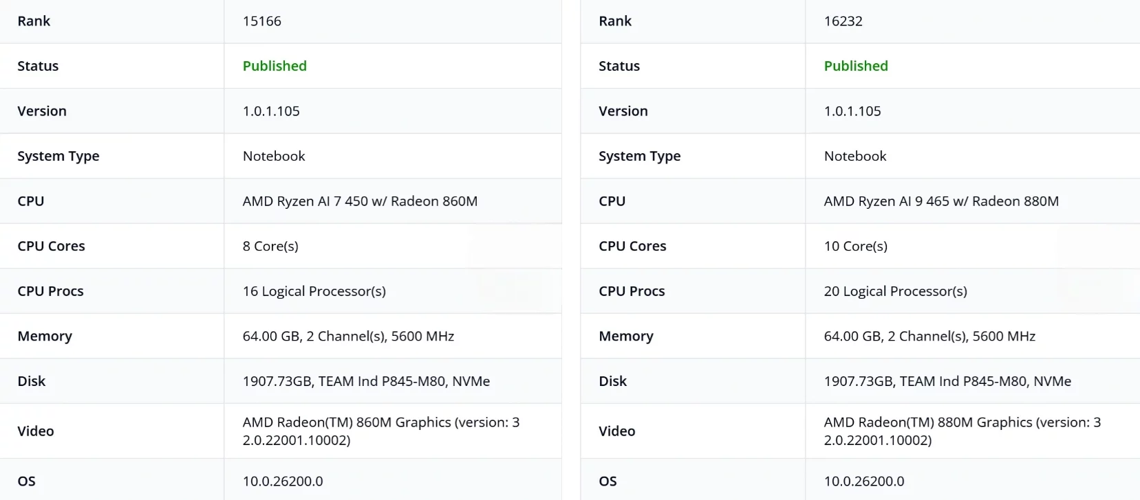 Два новых мобильных процессора от AMD, которые пока не представлены официально, были замечены в открытой базе данных. Речь идет о моделях Ryzen AI 9 465 и Ryzen AI 7 450, чьи тестовые результаты опубликовал консорциум BAPCo.