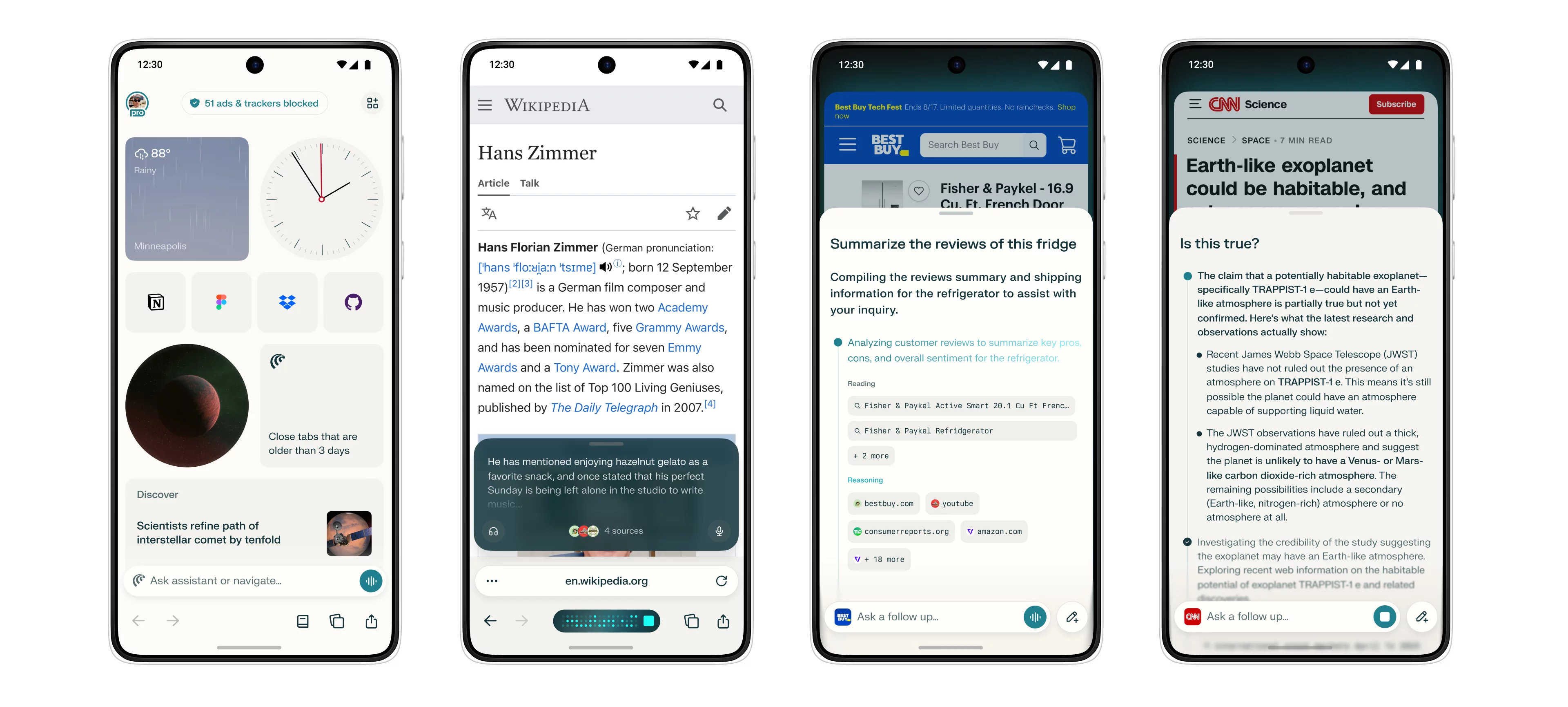 - Помощник умеет анализировать одновременно все открытые вкладки, находя и обобщая информацию из нескольких источников;