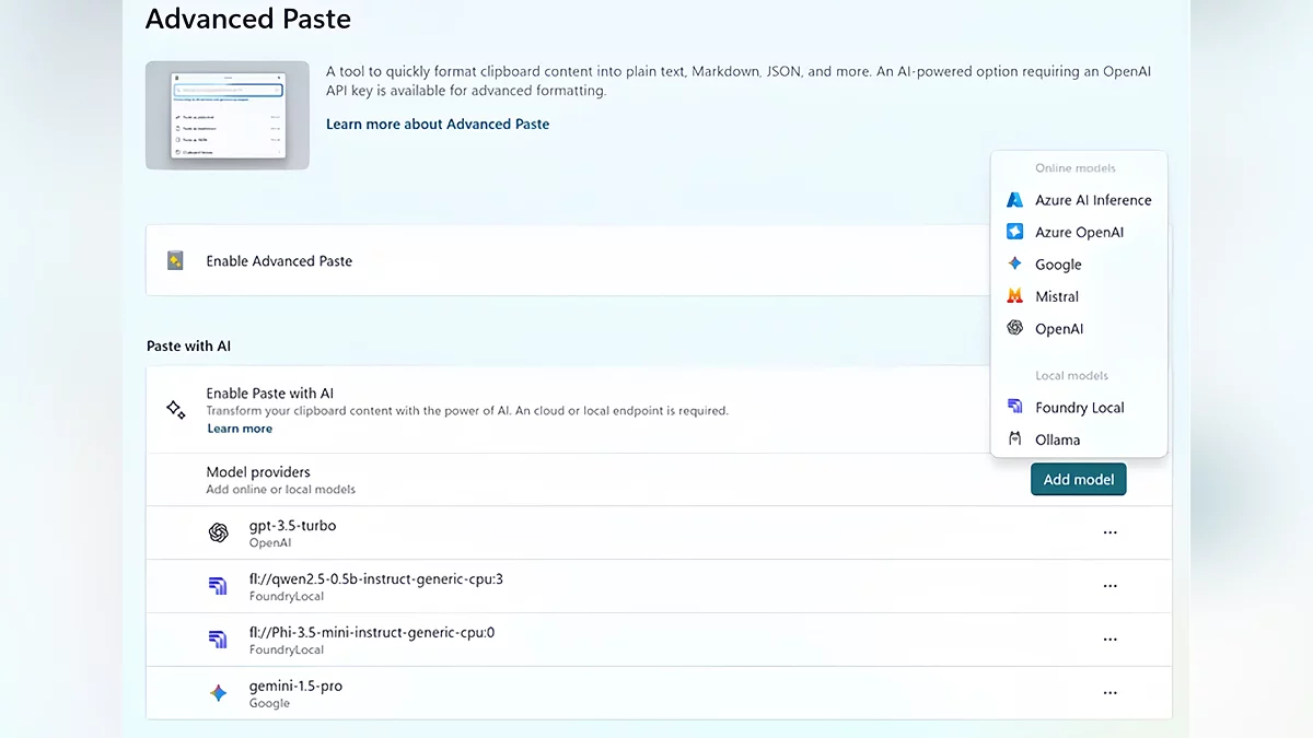 Помимо локальных моделей, разработчики значительно расширили список поддерживаемых онлайн-решений. Теперь Advanced Paste совместим с такими платформами, как Azure, OpenAI, Gemini и Mistral, предоставляя пользователям широкий выбор инструментов для разных задач. Интерфейс инструмента также претерпел небольшие, но полезные изменения. В нем появилось отображение текущего содержимого буфера обмена и выпадающее меню для быстрого переключения между доступными ИИ-моделями, что делает работу с Advanced Paste более наглядной и удобной.