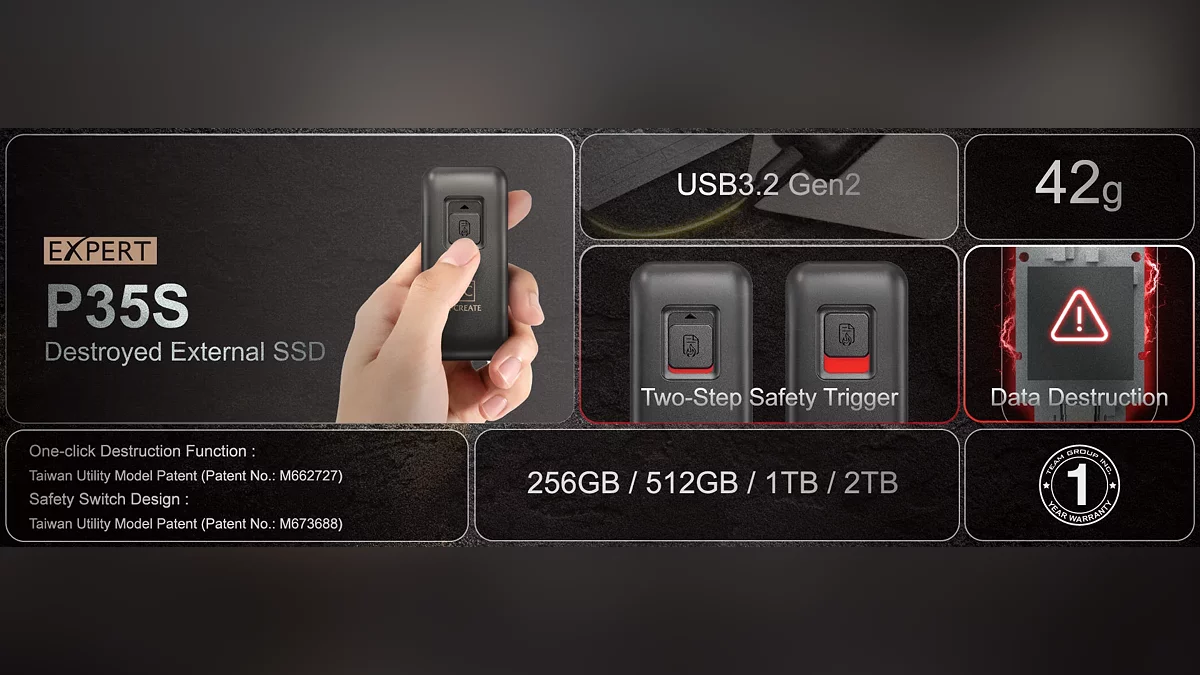 TeamGroup анонсировала необычное портативное хранилище — накопитель T-Create Expert P35S, а его ключевая особенность — физическая кнопка, активация которой необратимо выводит устройство из строя, делая информацию недоступной для восстановления. Новинка позиционируется как инструмент для специалистов, работающих с конфиденциальными данными: журналистов, юристов или сотрудников служб безопасности, где в критической ситуации пользователь может самостоятельно уничтожить всю информацию.