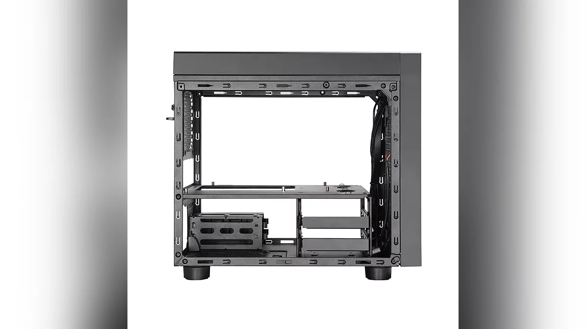 Внутренняя компоновка The Cube построена по двухкамерной схеме, которая сейчас встречается нечасто. Все горячие компоненты — материнская плата, процессор и видеокарта — сосредоточены в верхнем отсеке, при этом плата размещается горизонтально, а нижняя камера отведена под блок питания и накопители, что позволяет изолировать их от основной зоны нагрева.