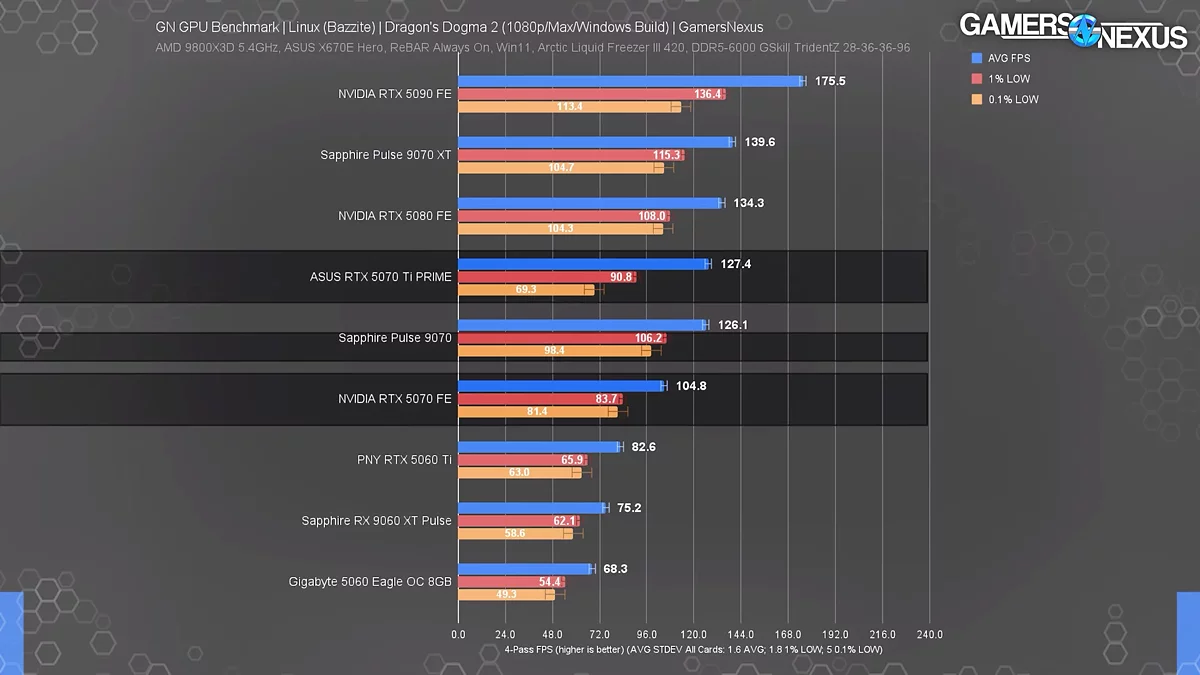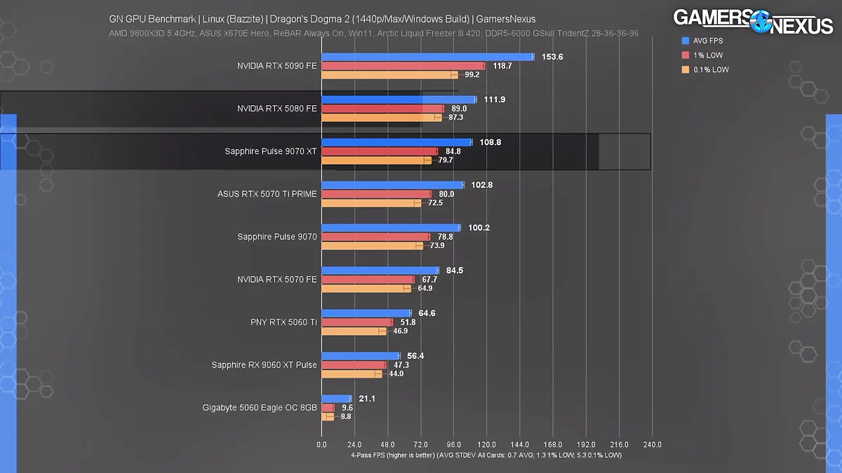 Еще одной «болевой точкой» для решений NVIDIA стал Black Myth: Wukong, тут хотя средний показатель частоты кадров был высоким, графические адаптеры компании демонстрировали серьезные просадки в показателях 1% и 0.1% Low FPS. Карты AMD в этой же игре работали существенно стабильнее. В остальных играх, таких как Dragon's Dogma 2 и Resident Evil 4, видеокарты NVIDIA показывали себя достойно, однако решения от AMD часто оказывались эффективнее в своем ценовом классе. К примеру, Radeon RX 9070 XT в Dragon's Dogma 2 демонстрировал производительность на уровне более дорогой GeForce RTX 5080.
