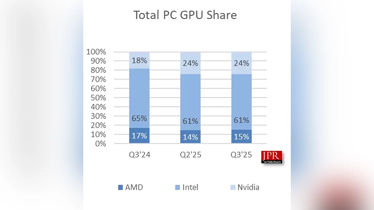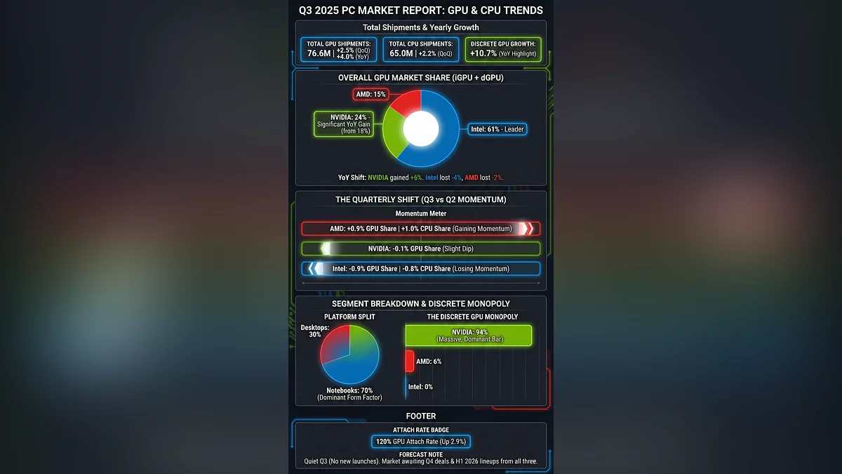 Стали известны результаты третьего квартала 2025 года на мировом рынке графических процессоров. Суммарно отгрузки графических чипов выросли на 2.5% по сравнению со вторым кварталом и достигли 76.6 миллионов единиц. Годовой рост составил 4%, а особенно заметной динамикой стало увеличение поставок дискретных видеокарт — сразу на 10.7% за год, что указывает на стабильный спрос на более производительные решения.