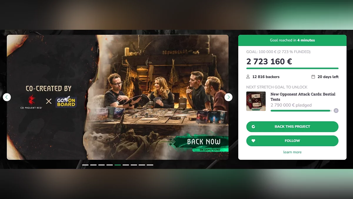 На краудфандинговой площадке Gamefound стартовала кампания по сбору средств на создание настольной игры The Witcher: Legacy. Цель состояла в том, чтобы собрать €100000, и она была выполнена всего за 4 минуты после старта.