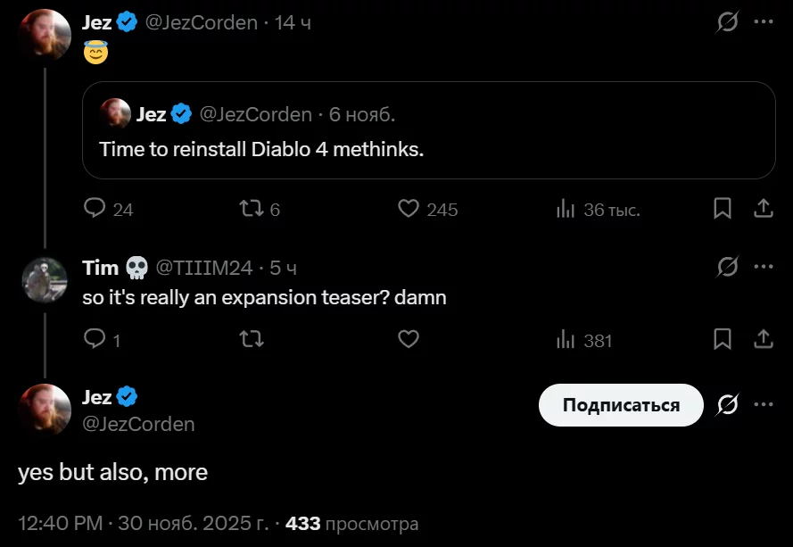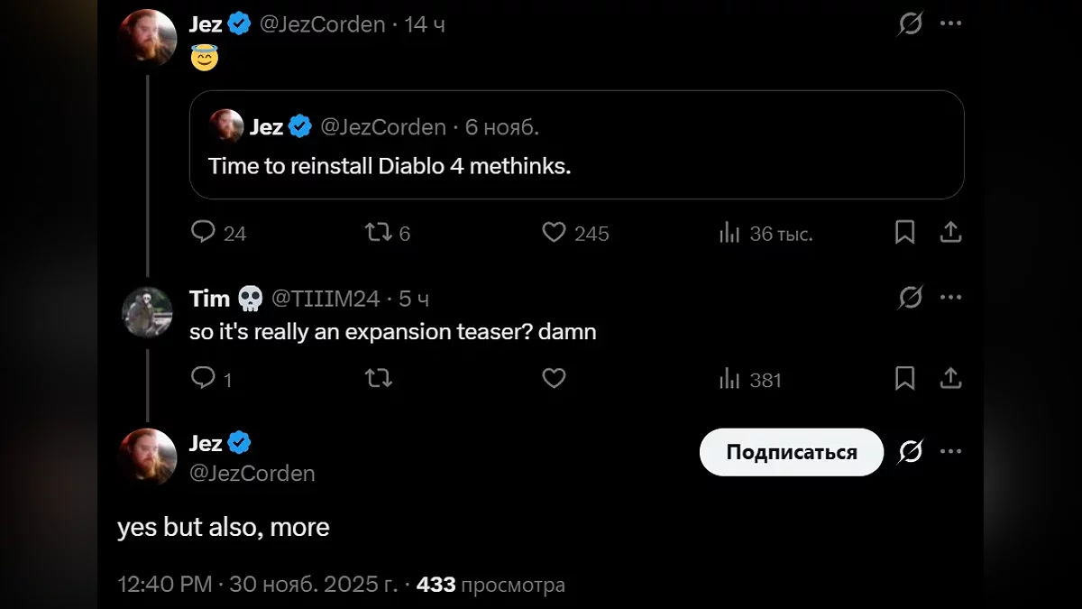 Журналист и инсайдер Джез Корден (Jez Corden) из Windows Central решил опровергнуть догадки и заявил, что ведущий The Game Awards тизерит второе крупное дополнение для Diablo 4.