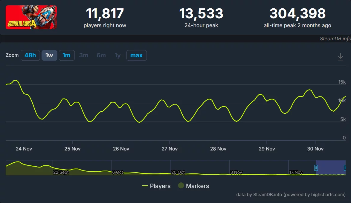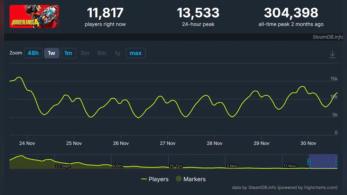 Несмотря на высокие оценки критиков, лутер-шутер Borderlands 4 не смог удержать аудиторию. Спустя два с половиной месяца количество игроков в Steam сократилось на 96%.