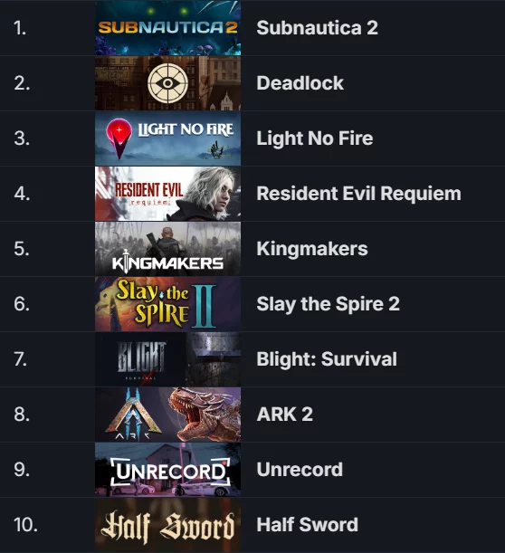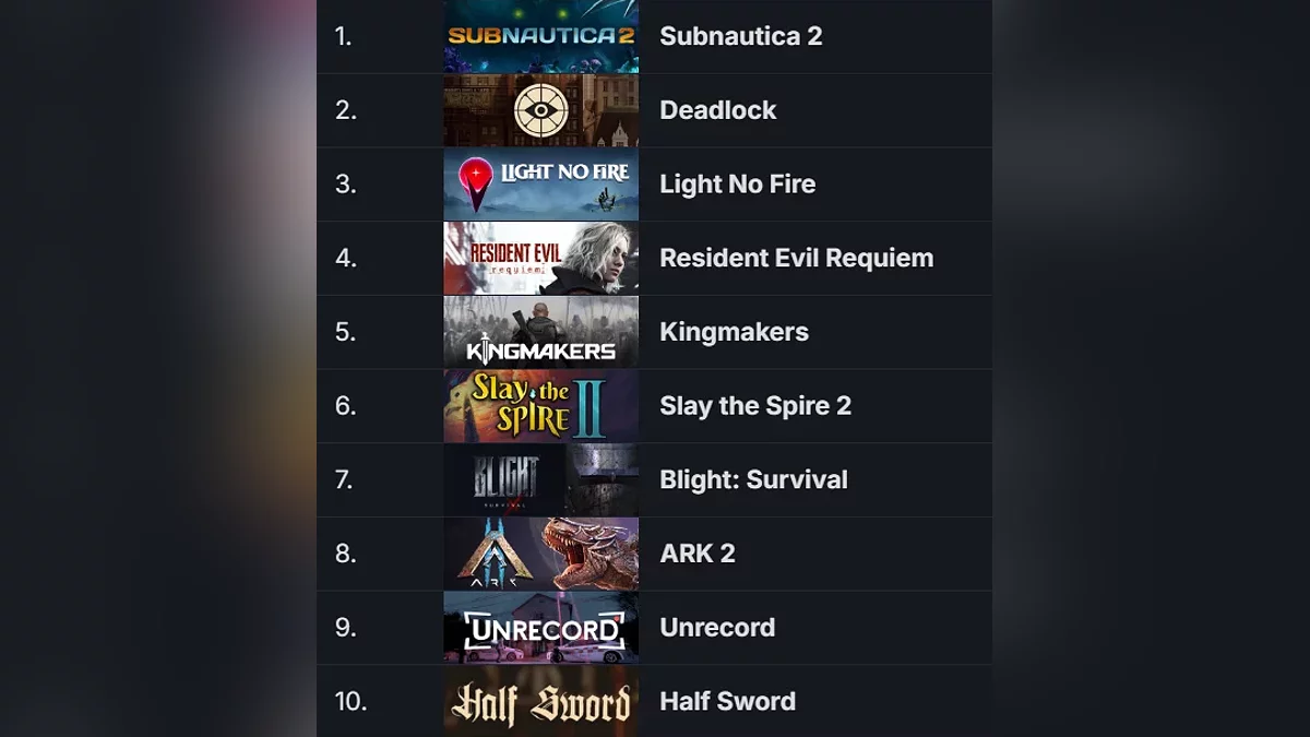 Что касается остальных проектов, то первое место в топе занял симулятор выживания в подводном мире от первого лица Subnautica 2, релиз которого намечен на 2026 год. На второй позиции оказался тактический MOBA-шутер от третьего лица Deadlock, над которым работает компания Valve. На третьей строчке расположилась Light No Fire — новая игра студии Hello Games, известной по No Man's Sky.