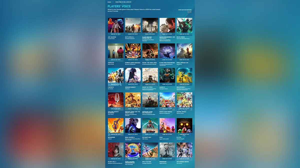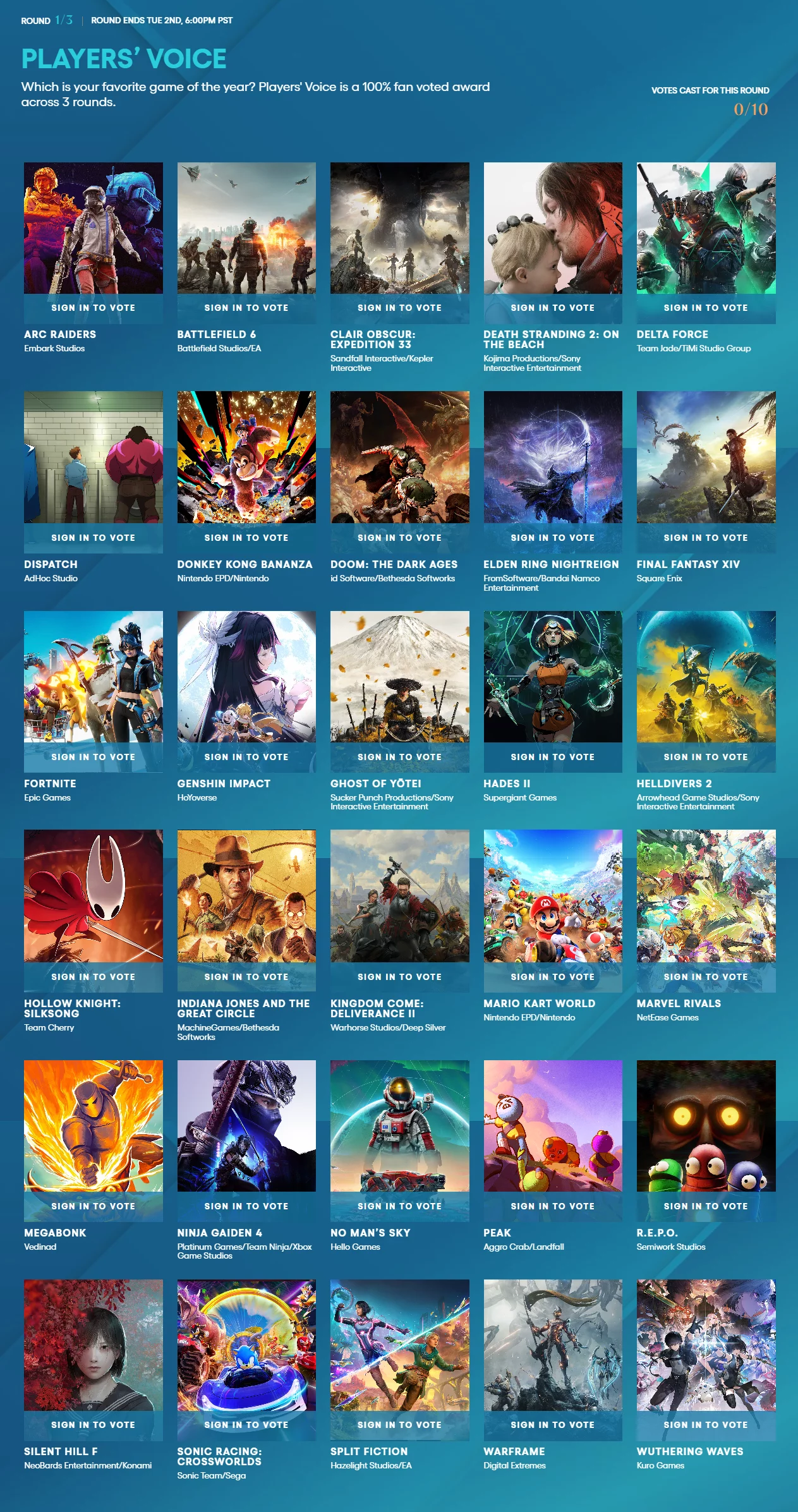 В первый этап попали Arc Raiders, Battlefield 6, Clair Obscur: Expedition 33, Death Stranding 2: On The Beach, Delta Force, Dispatch, Donkey Kong Bananza, Doom: The Dark Ages, Elden Ring Nightreign, Final Fantasy XIV, Fortnite, Genshin Impact, Ghost of Yotei, Hades 2, Helldivers 2, Hollow Knight: Silksong, Indiana Jones and the Great Circle, Kingdom Come: Deliverance 2, Mario Kart World, Marvel Rivals, Megabonk, Ninja Gaiden 4, No Man's Sky, Peak, Sonic Racing: CrossWorlds, Silent Hill f, R.E.P.O., Split Fiction, Warframe и Wuthering Waves.