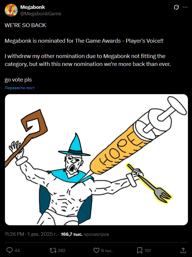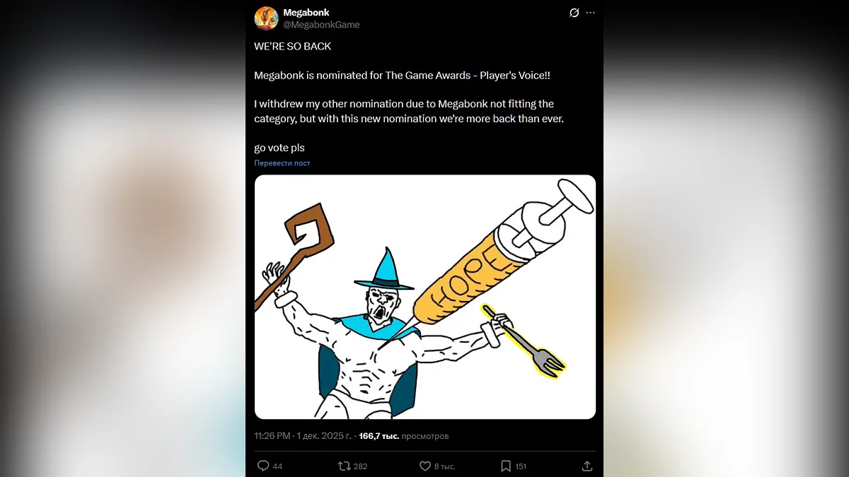 «МЫ ВЕРНУЛИСЬ! Megabonk номинирована на премию The Game Awards в номинации «Голос игроков»!! Я отозвал свою предыдущую номинацию, поскольку Megabonk не соответствовал категории, но с этой новой номинацией мы живы как никогда прежде. Сходите и проголосуйте, пожалуйста»