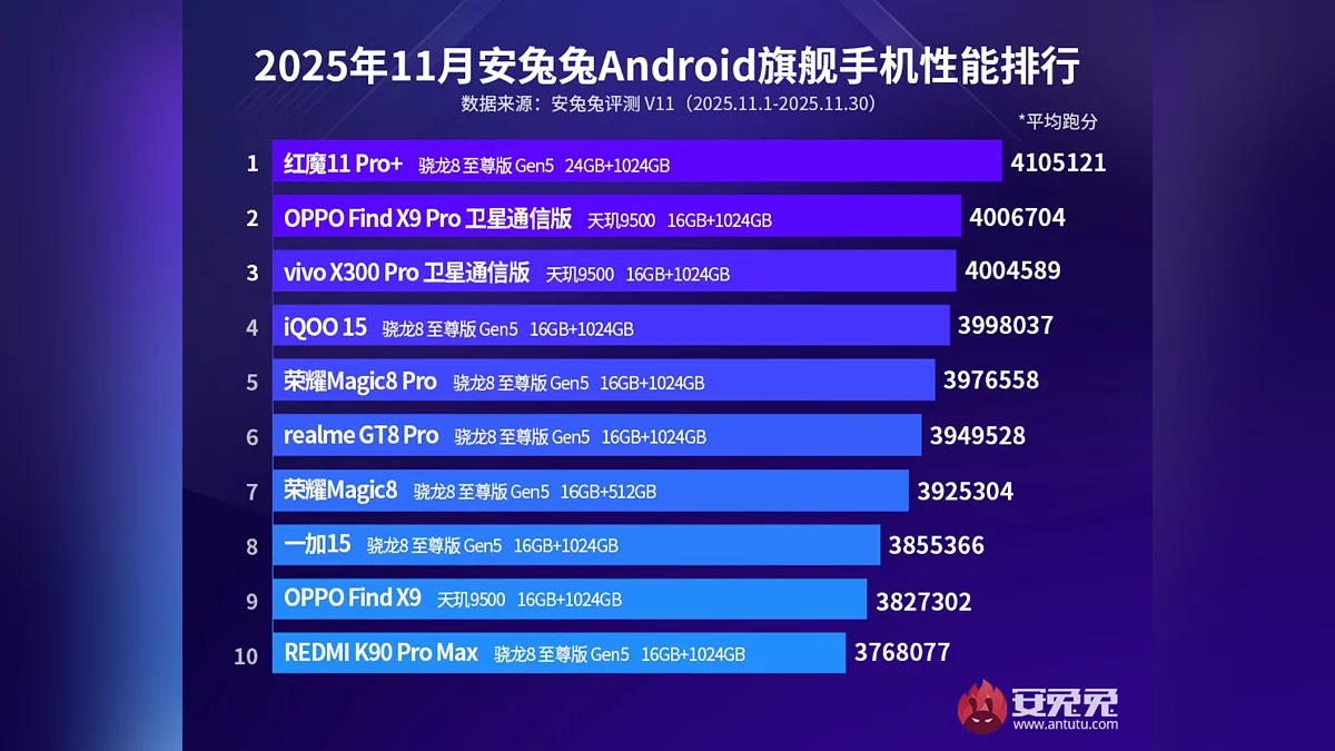 Абсолютным лидером стал игровой RedMagic 11 Pro+, который оснащён не только пассивным охлаждением, но и активным вентилятором с жидкостной системой, набрав рекордные 4,1 миллиона баллов. Такой результат стал возможным благодаря использованию чипа Qualcomm Snapdragon 8 Elite Gen 5 в конфигурации с увеличенным объёмом оперативной памяти.