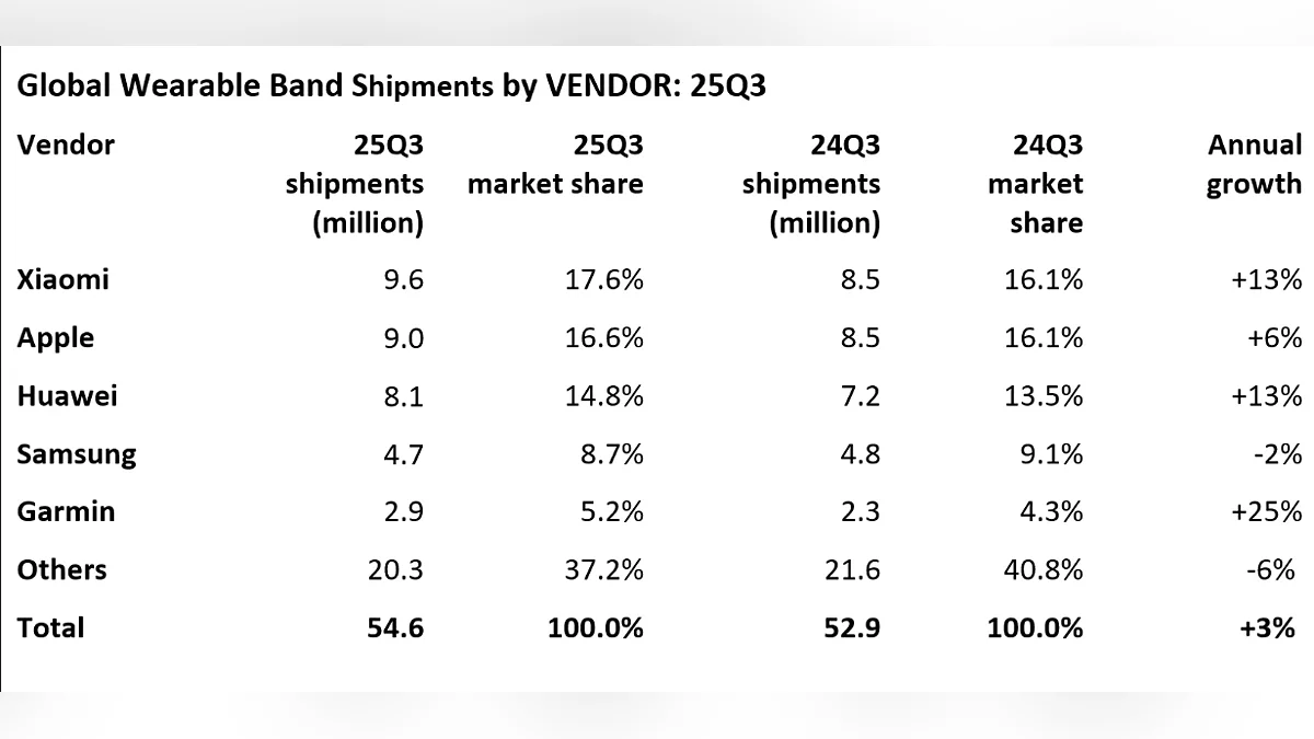 В третьем квартале 2025 года мировой рынок носимых устройств, включающий смарт-браслеты и часы, показал умеренный, но уверенный рост. Согласно свежим данным аналитиков, отгрузки увеличились на 3%, достигнув 54,6 миллионов штук, при этом общая стоимость рынка выросла значительно сильнее — на 12%, что указывает на постепенный переход потребителей к более технологичным и дорогим моделям.