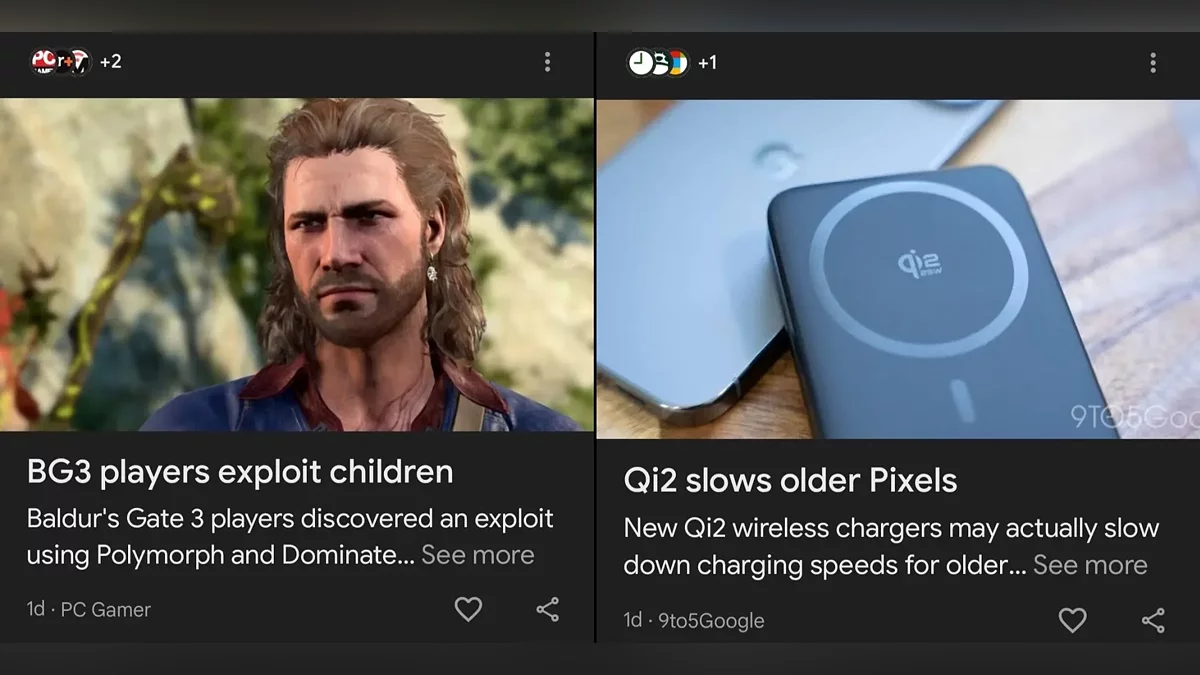 В рекомендательной ленте Google Discover стали появляться необычные заголовки новостей. Они кардинально отличались от оригинальных и часто выглядели как откровенный кликбейт. Например, некоторые пользователи видели формулировки вроде «Игроки Baldur's Gate 3 эксплуатируют детей» или «Зарядка Qi2 замедляет старые телефоны Pixel». При переходе на статью выясняется, что содержание не имеет ничего общего с таким заголовком, а новость о Baldur's Gate 3 на самом деле была саркастическим комментарием об элементах игры.