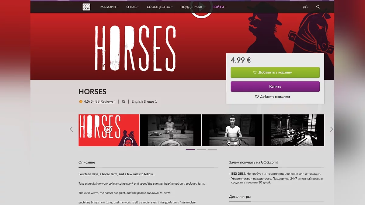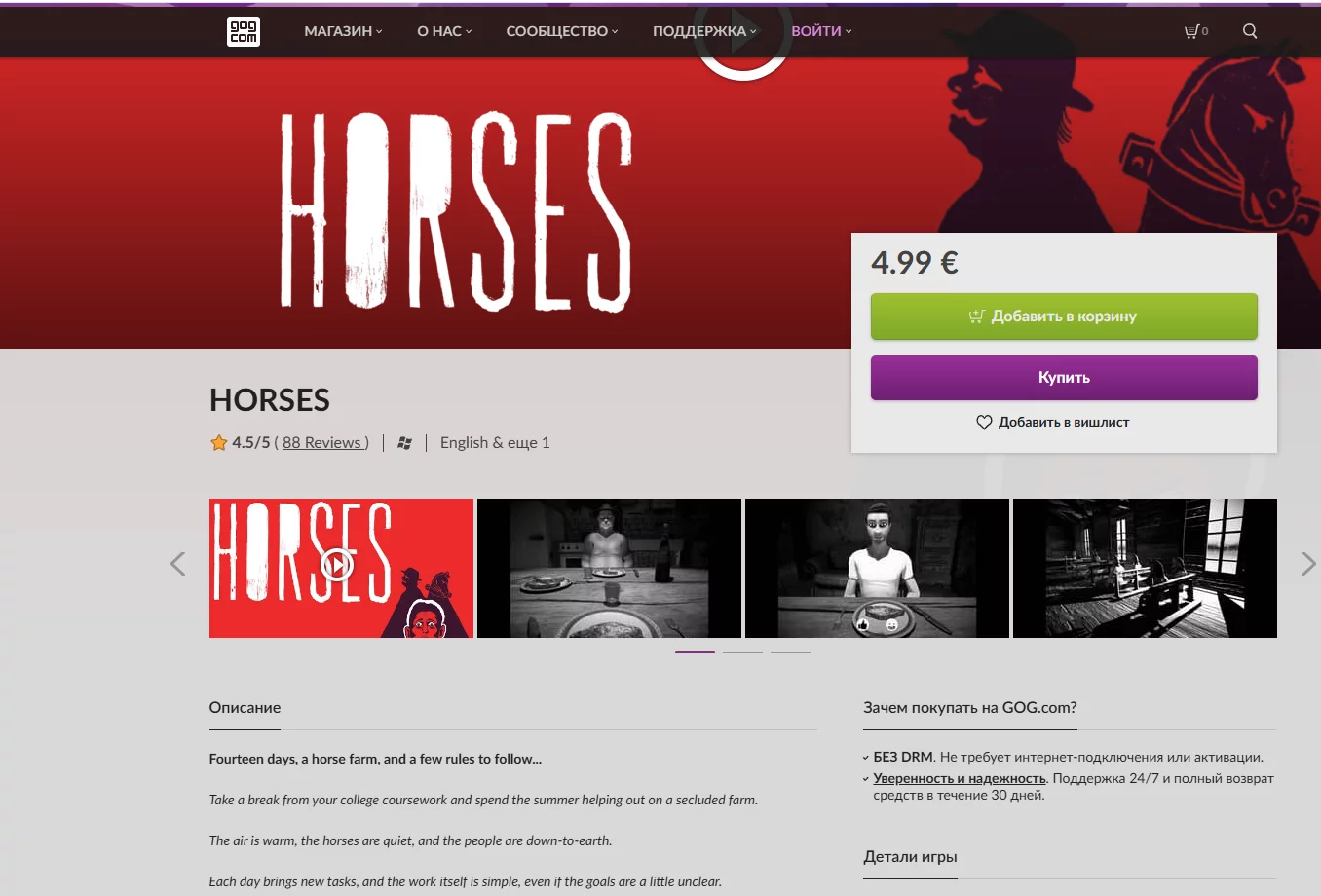 В GOG рейтинг игры сейчас 4.5/5 по пользовательским отзывам, и многие владельцы прямо указывают, что узнали о проекте именно из-за запрета. Игроки отмечают необычный визуальный стиль, смелую тему и подчёркнутую аллегоричность. Многие сравнивают Horses с сюрреалистическим кино и называют одной из тех игр, которые существуют «не для всех», но именно потому и ценны.
