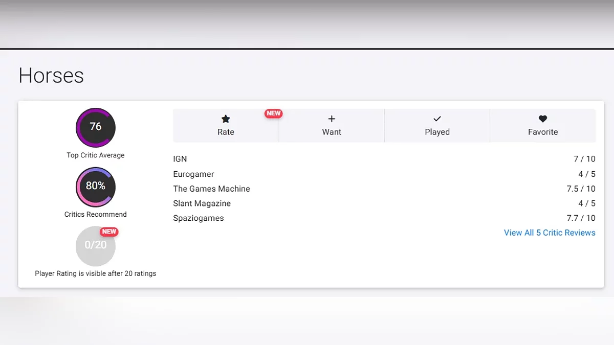 На Metacritic у игры сейчас 77/100 по семи рецензиям, а OpenCritic фиксирует средний балл 76, при этом 80% критиков рекомендуют проект. Для небольшой «скандальной» инди-работы — впечатляющий результат. Игру хвалят за сильную атмосферу, интересное исследование нестандартных тем и небольшой хронометраж. Впрочем, за ровно за эти же вещи игру и ругают. Игровой процесс давит, поднимаемые вопросы вызывают тревогу, а сестра таланта не дает игре запомниться. Несмотря на всё это, критики называют Horses одним из самых необычных и смелых хорроров года.