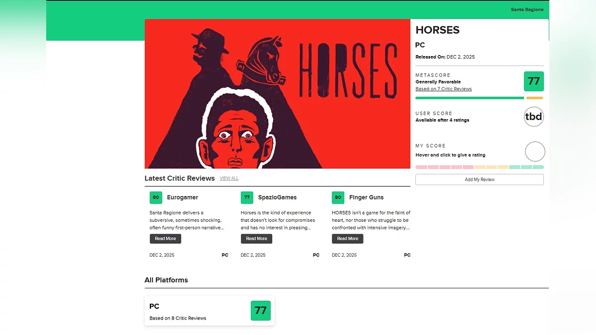 Итальянская студия Santa Ragione переживает необычную неделю: её новый психологический хоррор Horses, который Steam ранее отказался публиковать, а Epic Games Store отозвал в последний момент, вышел на ПК 2 декабря и собрал неожиданно высокие оценки прессы.