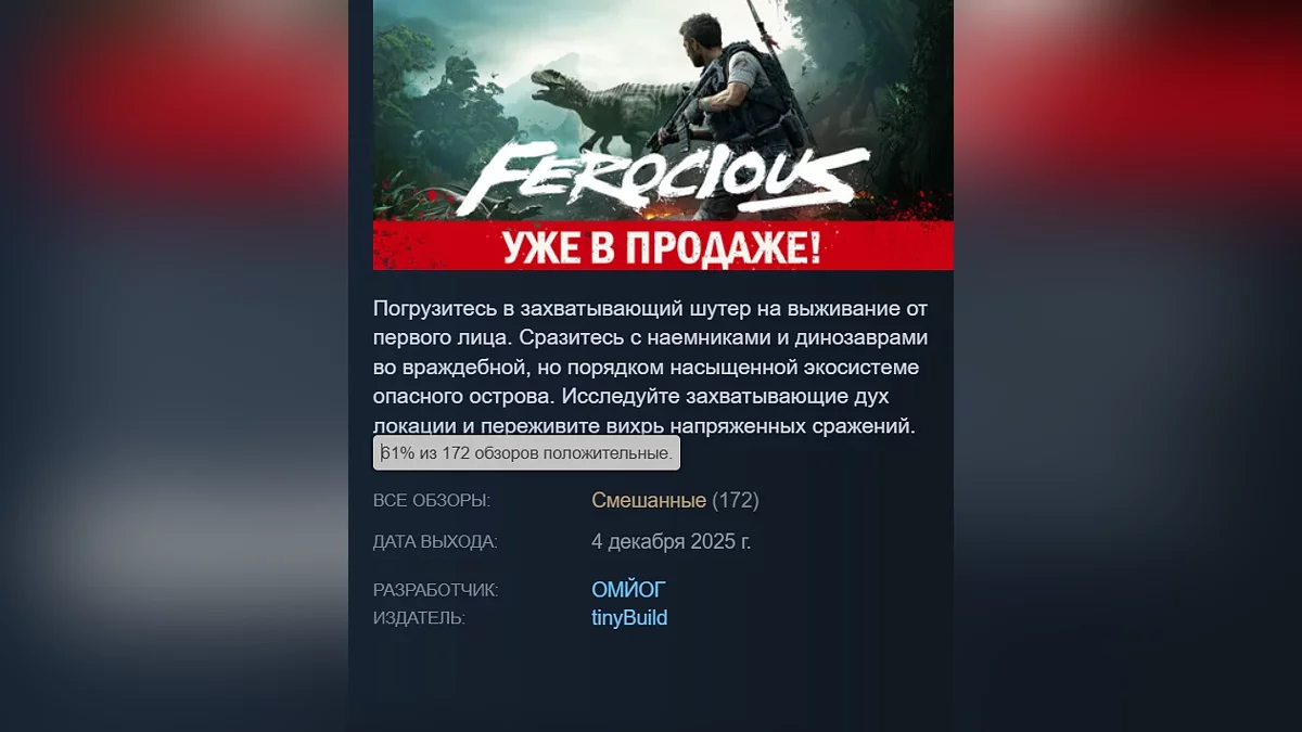4 декабря в Steam состоялся релиз одиночного шутера Ferocious, события которого разворачиваются на острове с динозаврами. Игроки прохладно встретили новинку — она получила 61% рейтинга.