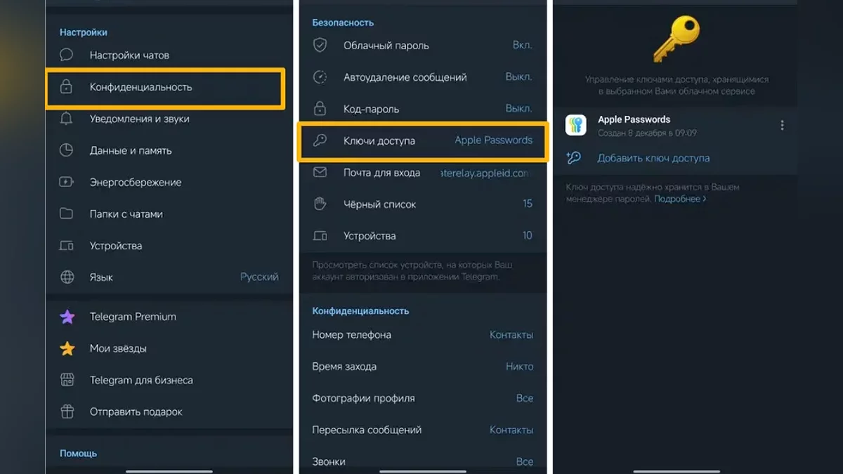 Технология позволяет привязать доступ к мессенджеру непосредственно к устройству — смартфону или планшету. Для входа в аккаунт достаточно подтвердить личность с помощью Face ID, отпечатка пальца или даже PIN-кода для разблокировки экрана. Сами криптографические ключи надежно хранятся в защищенном хранилище операционной системы. а при желании их можно использовать и в сторонних менеджерах паролей.