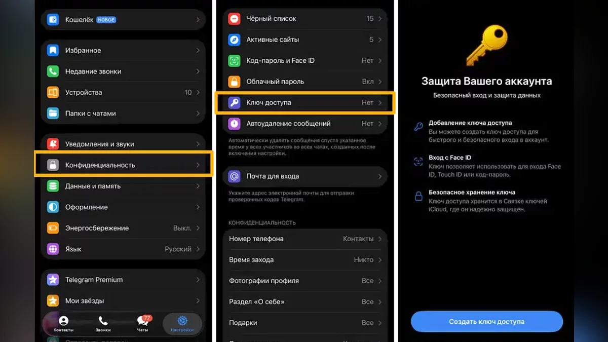 Для того чтобы активировать новую функцию в разделе «Настройки» → «Конфиденциальность» нужно активировать новый пункт «Ключи доступа», после чего система создает уникальную цифровую связку между устройством и аккаунтом Telegram. В дальнейшем, при необходимости войти в мессенджер (например, после переустановки), вместо поля для SMS-кода появится запрос на биометрическое подтверждение или ввод кода блокировки устройства.