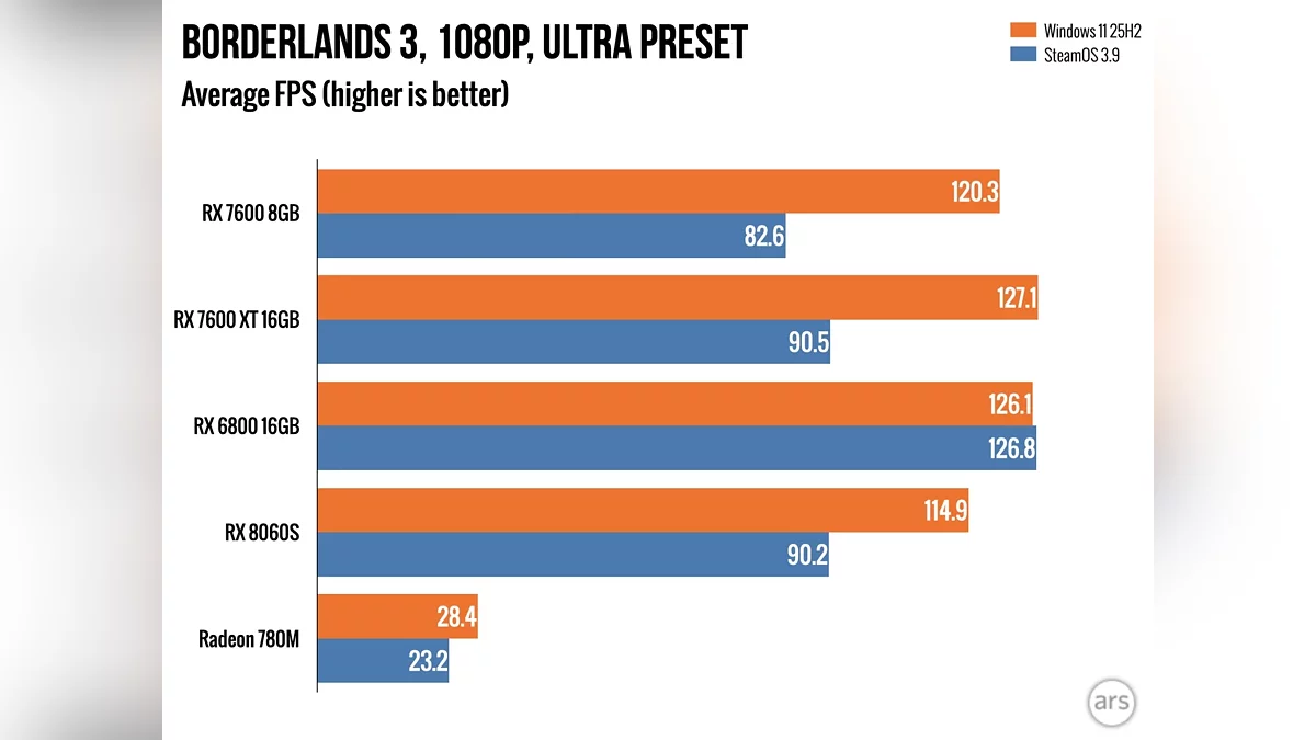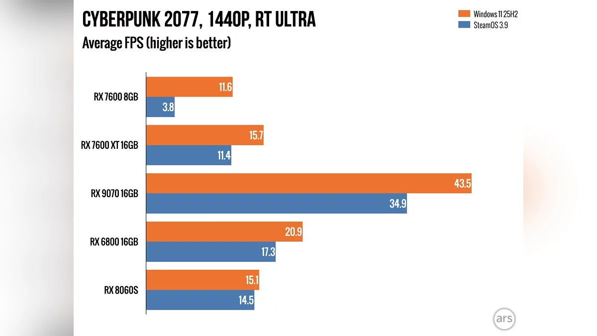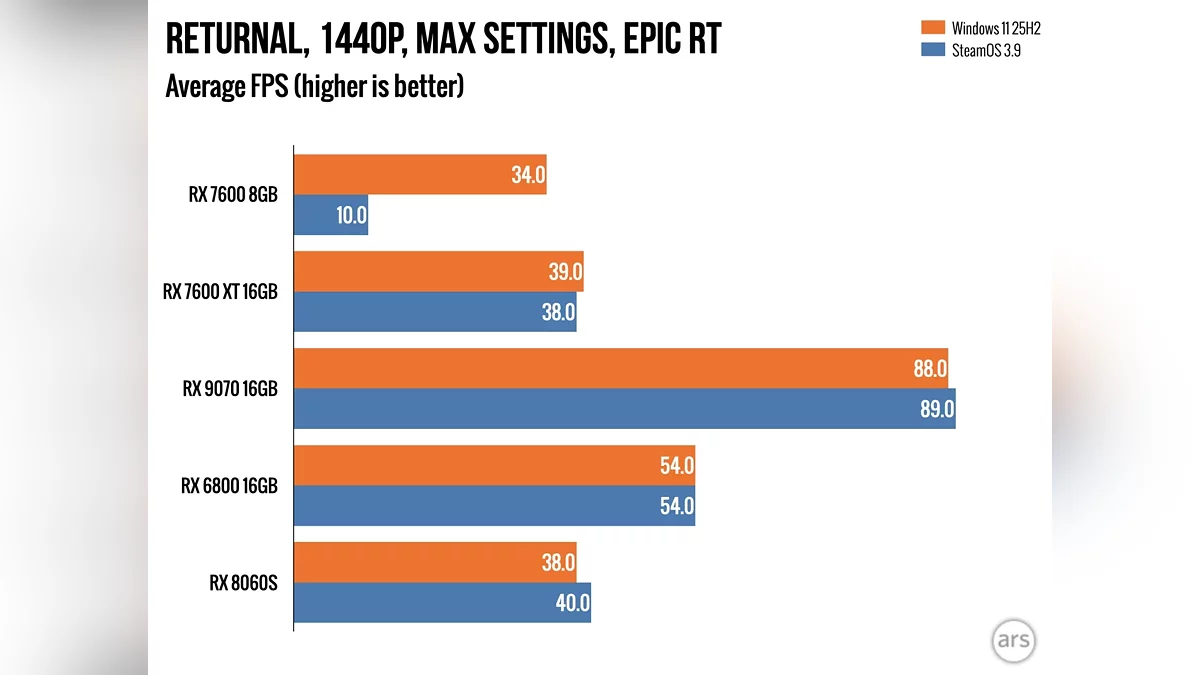 На дискретных видеокартах Windows 11 25H2 в среднем демонстрирует более высокую или равную частоту кадров. Разрыв становится особенно заметным в современных проектах с активным использованием видеопамяти. Например, в некоторых сценариях с трассировкой лучей преимущество Windows достигало 15-25% на картах с 16 ГБ памяти. Отдельное внимание привлекла работа системы с видеокартами, оснащёнными 8 ГБ видеопамяти, как у анонсированной Steam Machine. В ряде игр, таких как Returnal и Cyberpunk 2077, SteamOS сильнее упиралась в лимит памяти по сравнению с Windows, что приводило к более существенному падению производительности. На тестовой Radeon RX 7600 (8 ГБ) разница в пользу Windows в отдельных моментах превышала 60%.