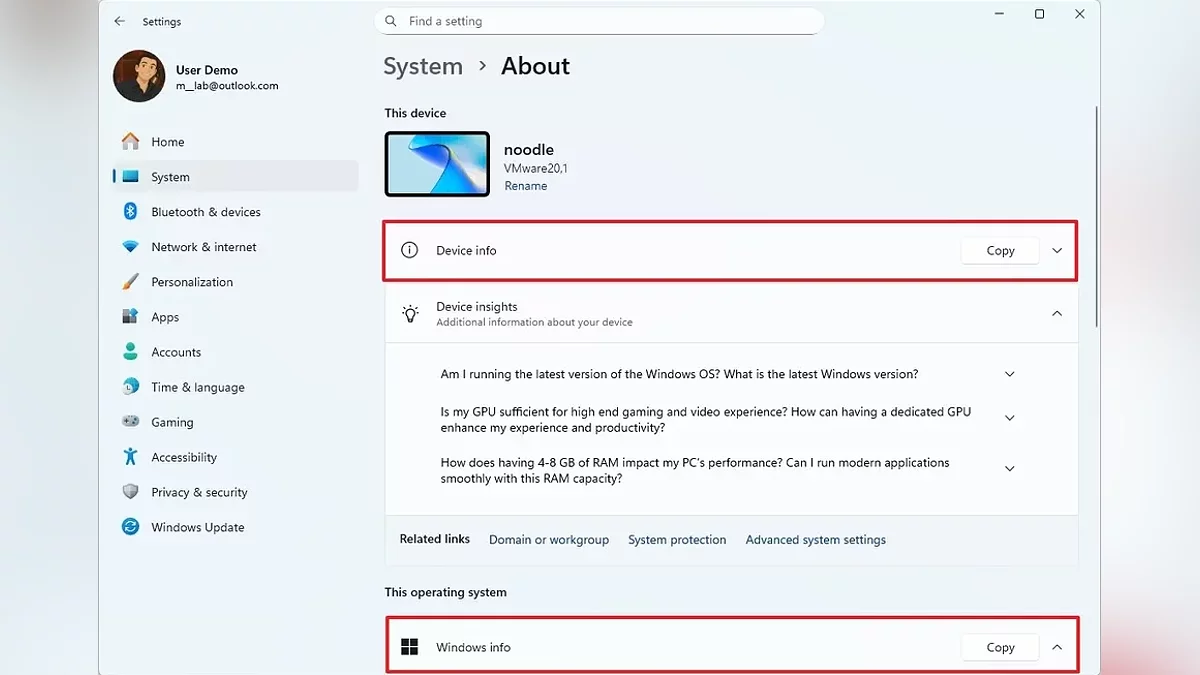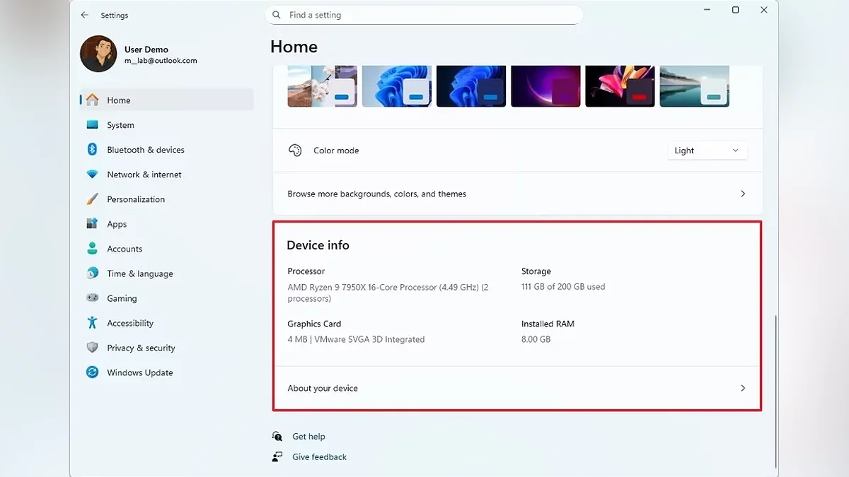 В приложении «Параметры» произойдет несколько структурных перемен. На главной странице появится новая карточка «Сведения об устройстве», где будут отражены ключевые технические характеристики компьютера, а страница «О системе» снова меняет дизайн: акцент смещается на фоновое изображение рабочего стола и возможность переименования PC, а технические данные были перенесены в отдельный раздел.