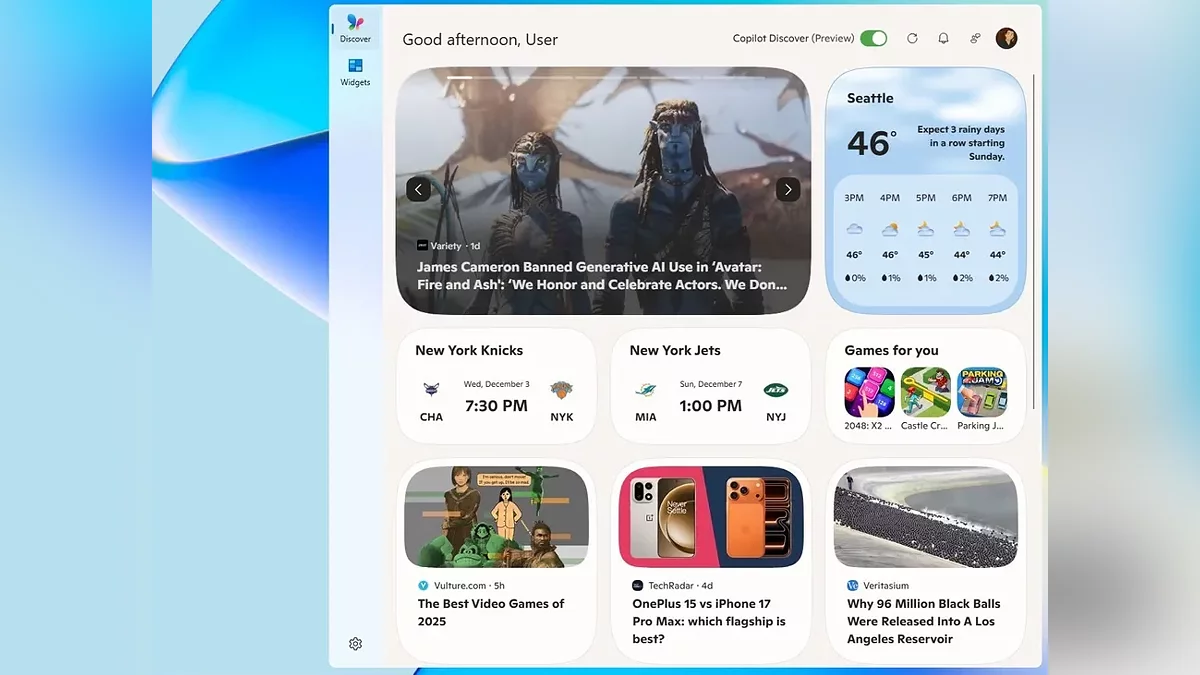 Любителям динамических обоев Windows Spotlight теперь будет проще переключаться между картинками. В контекстном меню рабочего стола добавятся пункты «Следующий фон» и возможность узнать больше о текущем изображении через поиск Bing. Обновление также затрагивает работу с виджетами, сама панель виджетов получила новый дизайн с раздельными вкладками для самих виджетов и ленты «Discover», а настройки теперь интегрированы прямо в интерфейс панели.