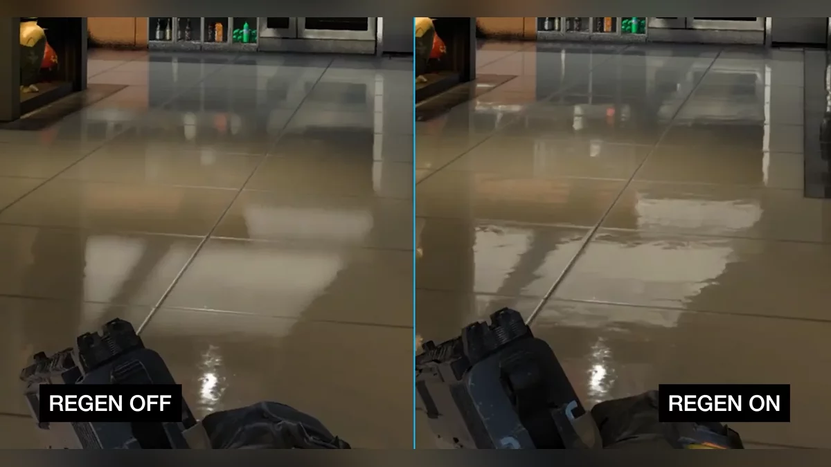 Единственной доступной для теста игрой с поддержкой Ray Regeneration оказался Call of Duty: Black Ops 7. Эта технология, призванная очищать изображение при трассировке лучей. Благодаря использованию технологии водные поверхности и глянцевые полы теряли зернистость и становились чётче, а также добавились детали в световых бликах и контурной подсветке объектов. Из-за отсутствия реализации в других играх провести глубокое сравнение с аналогом от NVIDIA (Ray Reconstruction) не удалось.