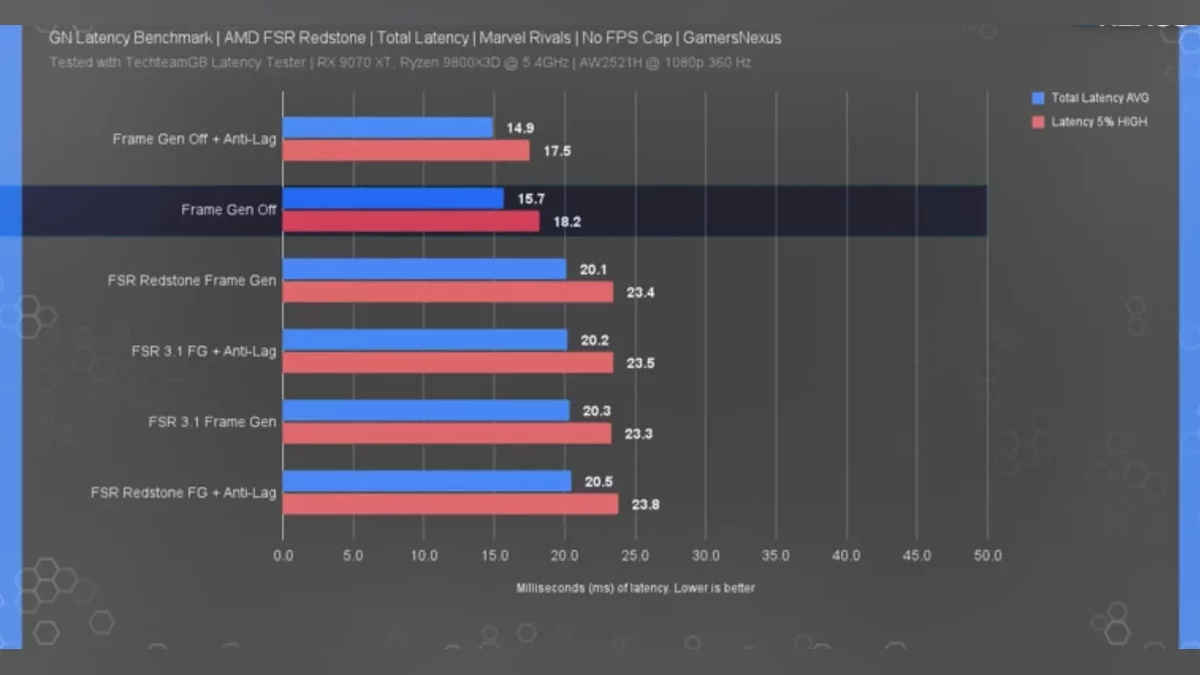 Один из самых важных для геймеров тестов — измерение полной системной задержки (end-to-end latency) и вовсе не показал разницы между поколениями. В Marvel Rivals включение любого генератора кадров (Redstone или FSR 3.1) увеличивало задержку примерно на 22% по сравнению с игрой без него, а функция Anti-Lag в этой конфигурации значимого эффекта не дала. В Cyberpunk 2077 картина аналогична: генерация кадров добавляла 4-8 мс задержки, причём показатели Redstone и FSR 3.1 находились в пределах погрешности друг друга.