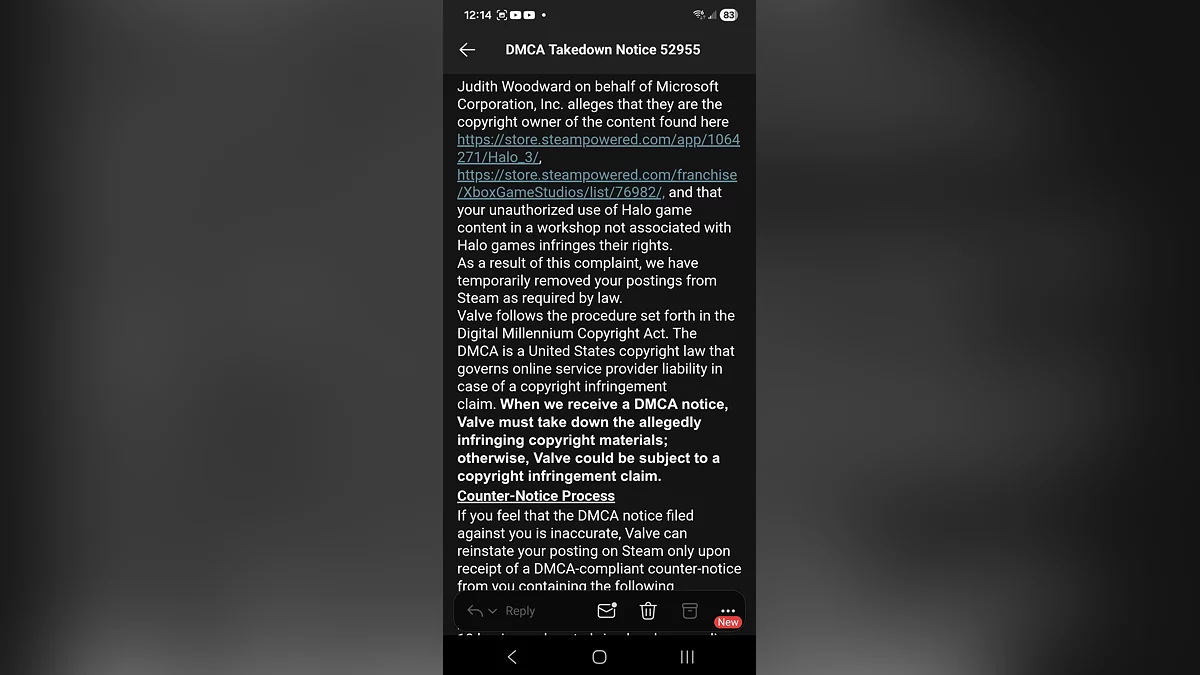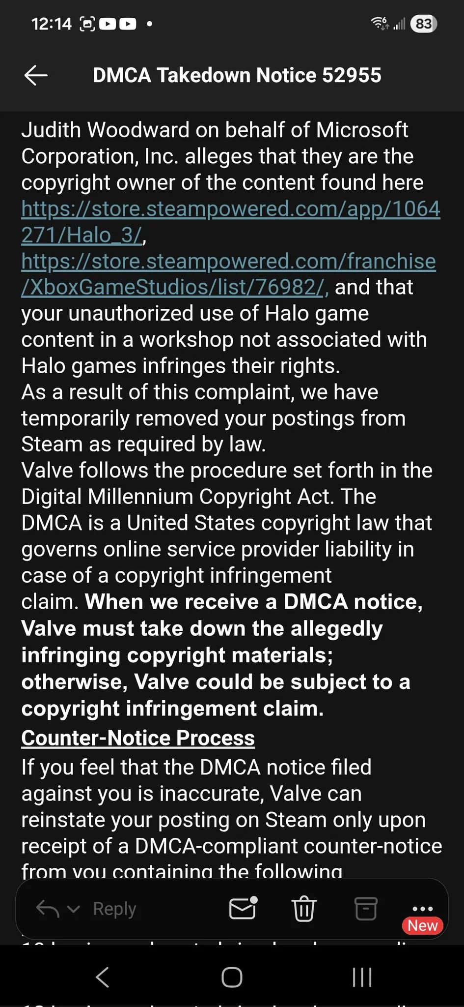 Однако на этом всё закончилось. Соавтор мода под ником Forddoyo опубликовал в X скриншот уведомления, полученного через Valve от имени Microsoft. В нём Microsoft заявляет, что мод использует контент игр Halo без разрешения, а потому нарушает права правообладателя. В результате Valve временно удалила все материалы Project Misriah из Steam Workshop. Судя по реакции авторов, оспаривать решение они не планируют.