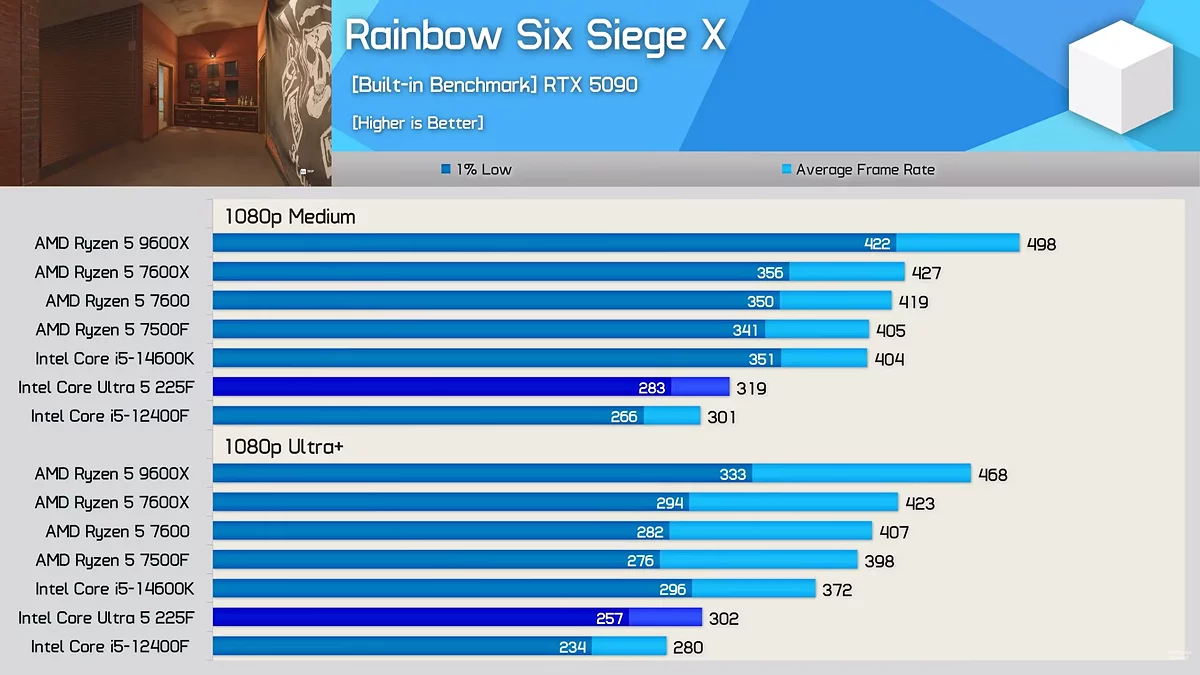 В отдельных проектах картина выглядит ещё менее выигрышно. В Rainbow Six Siege новый процессор быстрее старого 12400F всего на 6–8%, тогда как Ryzen 5 7500F опережает его уже на 27–32%. В Cyberpunk 2077 отрыв от предшественника составляет 7–8%, а в Baldur's Gate 3 225F и вовсе показывает результат немного хуже, чем i5-12400F.