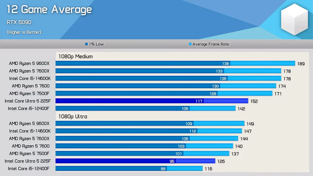 В синтетических бенчмарках, таких как Cinebench R24, 225F показывает результаты на уровне процессоров предыдущих поколений. Например, в многопоточных задачах он немного отстаёт даже от AMD Ryzen 5 7600X, что нехарактерно для Intel, традиционно сильной в подобных сценариях. Основное разочарование принесли игровые тесты в разрешении 1080p, где в среднем по 12 играм прирост производительности Core Ultra 5 225F по сравнению с Intel Core i5-12400F, который на несколько поколений старше, составил лишь 7–9%, при этом он стабильно отстаёт от основного конкурента — AMD Ryzen 5 7500F — на 9–13%, а от более производительных Core i5-14600K или Ryzen 5 9600X и вовсе на 17–24%.
