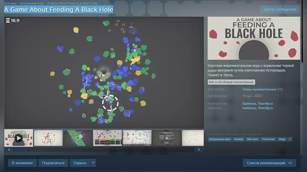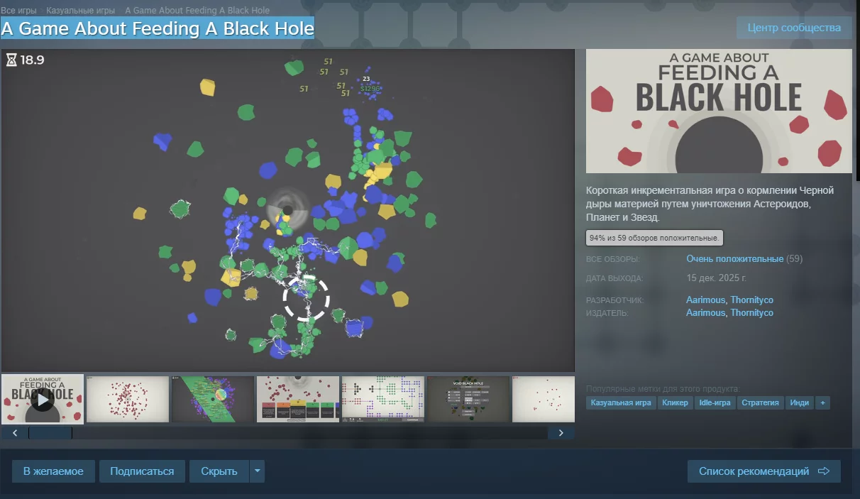 В Steam состоялся релиз инкрементальной игры A Game About Feeding A Black Hole про кормление чёрной дыры материальными элементами. Проект стартовал с очень положительным рейтингом — 95% на основе 69 отзывов.
