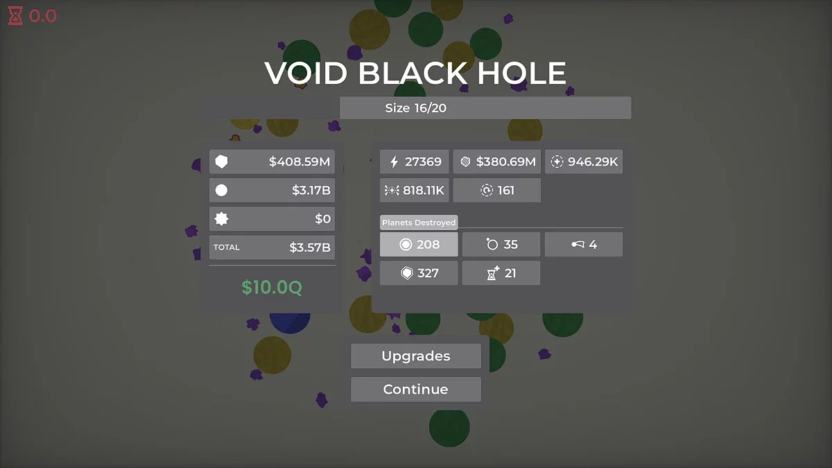 Игра построена вокруг простого, но затягивающего цикла: игрок уничтожает астероиды, планеты и звёзды, постепенно прокачивая эффективность и открывая новые возможности. Помимо основного режима доступны дополнительные варианты геймплея, система улучшений и тёмный режим интерфейса — всё в духе минималистичных idle- и incremental-игр.
