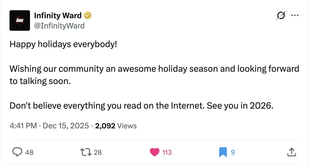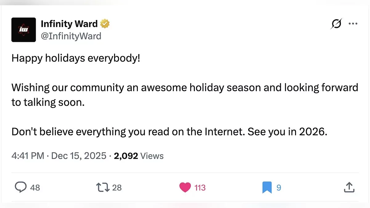 На фоне этого Infinity Ward опубликовала праздничное сообщение, в котором, помимо поздравлений, добавила важную ремарку. Разработчики призвали игроков «не верить всему, что они читают в интернете», и завершили пост фразой о том, что увидятся с фанатами в 2026 году. Формально студия не упомянула Modern Warfare 4 напрямую, однако это заявление было воспринято как явное опровержение последних утечек.