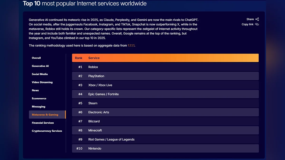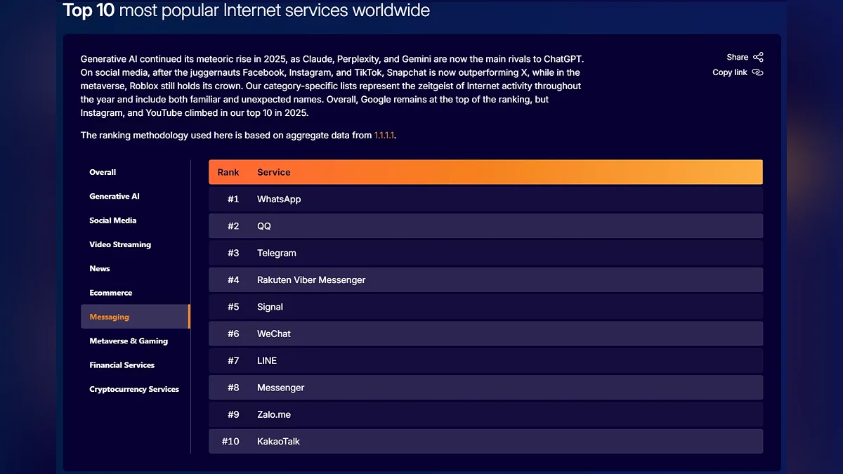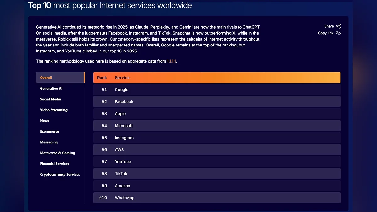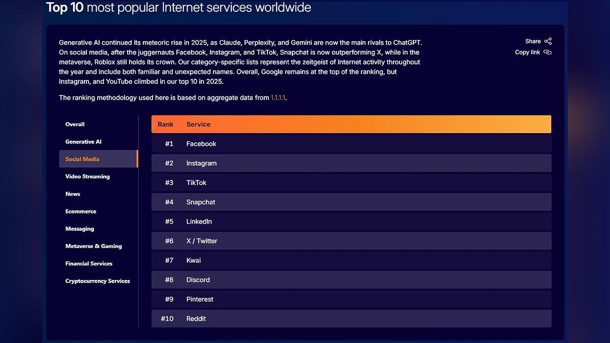 Среди пользовательских сервисов безоговорочным лидером остаётся Google. В социальных сетях X опустился на шестое место, уступив LinkedIn и Snapchat. В сегменте ИИ-сервисов лидирует ChatGPT, за которым следуют Claude от Anthropic, Perplexity и Google Gemini, а Grok занимает лишь девятое место.