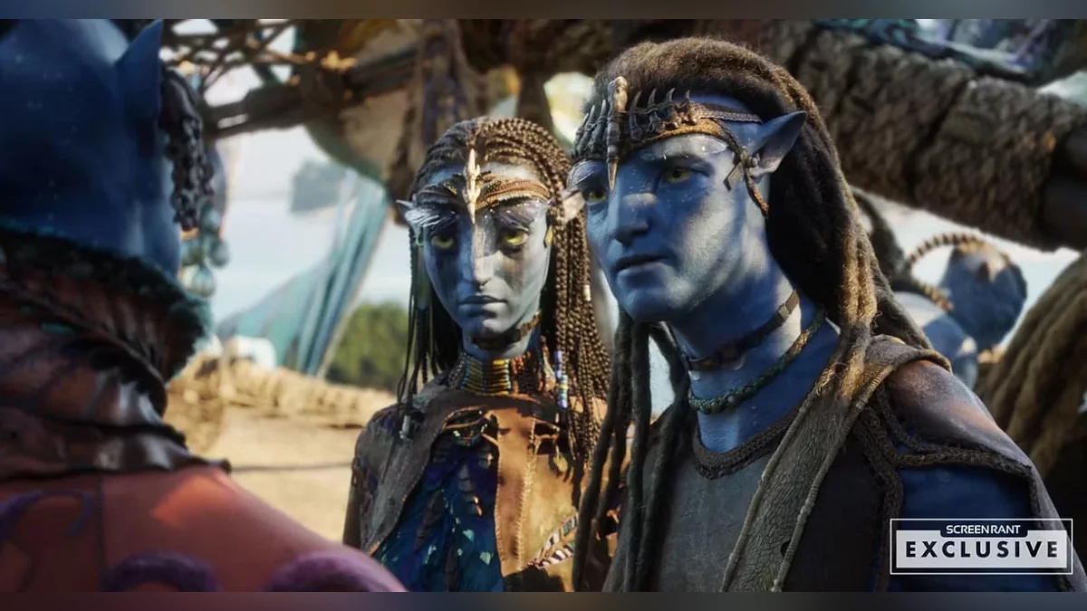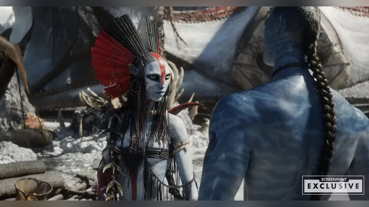 На первом кадре показано незнакомое для зрителя поселение. Джейк и Нейтири стоят в напряженной позе рядом с членом клана Манкван (Народ Пепла).