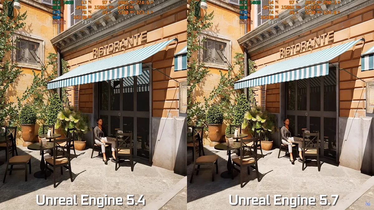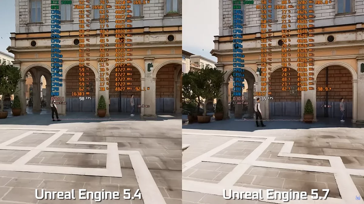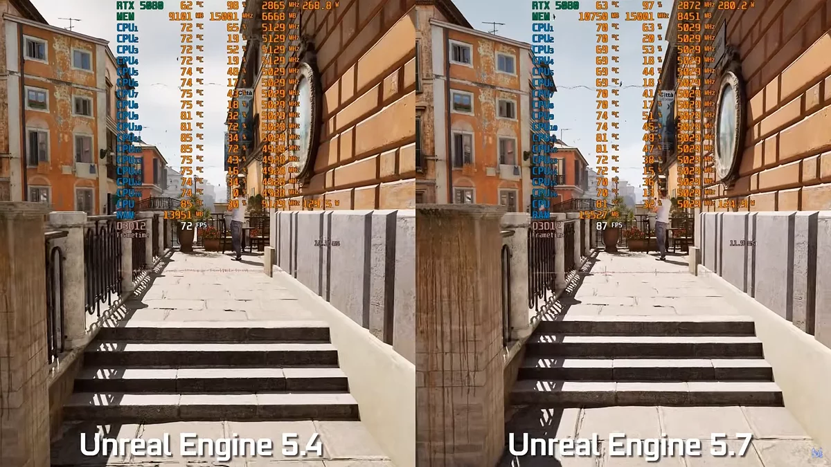 На YouTube-канале MxBenchmarkPC опубликованы результаты сравнения производительности игрового движка Unreal Engine в версиях 5.4 и 5.7. Тестирование проводилось на основе публичного технодемо Photorealistic Venice, которое позволяет переключаться между этими двумя ревизиями. Для эксперимента использовалась система с видеокартой NVIDIA GeForce RTX 5080 и процессором Intel Core i7-14700F. Обе сборки были запущены с настройками по умолчанию, включая технологию аппаратного рендеринга освещения Lumen.