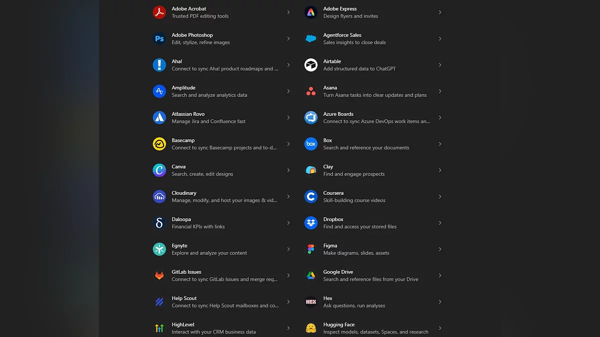 Ранее представленные «коннекторы», например для поиска по файлам из облачных хранилищ, теперь также объединены под общей концепцией приложений. Среди новых сервисов, доступных в каталоге — интеграция с Apple Music, которая позволяет пользователям искать музыку, создавать и редактировать плейлисты с помощью текстовых запросов, а управлять библиотекой могут обладатели подписки. Также в числе добавленных сервисов — DoorDash для формирования корзины покупок на основе рецептов и планов питания.