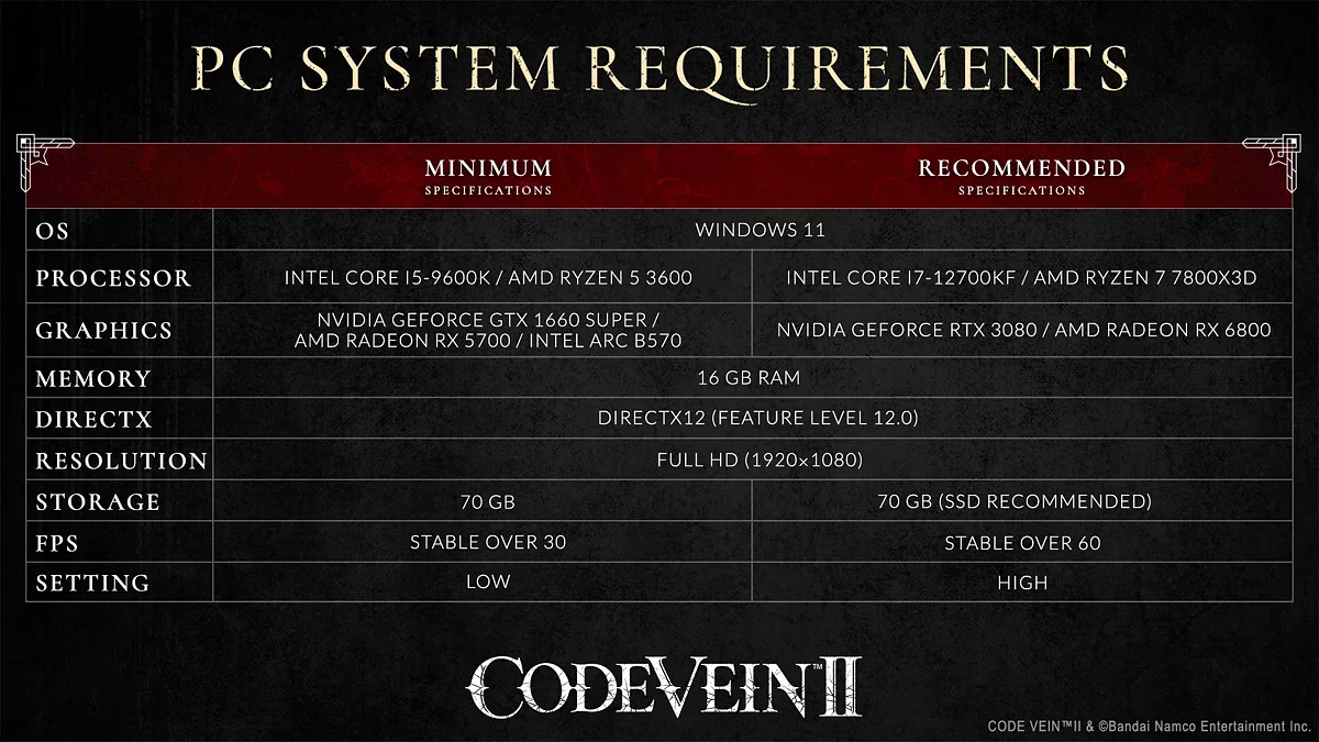 Компания Bandai Namco опубликовала системные требования PC-версии мрачного ролевого экшена Code Vein 2. Для запуска игры потребуется как минимум NVIDIA GeForce GTX 1660 Super.