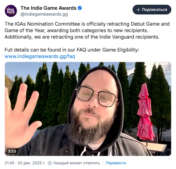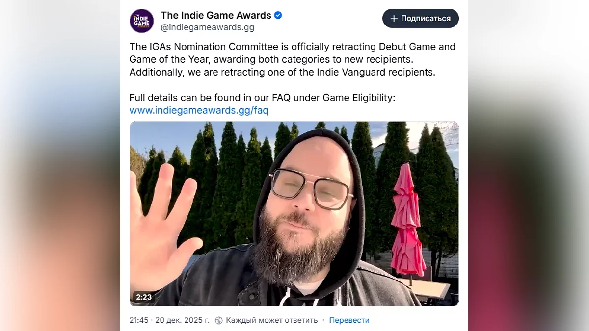 Комитет по номинациям IGA официально отзывает награды в категориях «Лучший дебют» и «Игра года» и объявляет новых победителей. Кроме того, мы аннулируем награду одного из лауреатов премии Indie Vanguard.