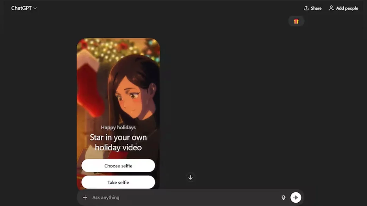 Пользователи ChatGPT обнаружили новую функцию, позволяющую получить короткое видеопоздравление с собой в главной роли. Для активации опции достаточно отправить в чат эмодзи подарка. После отправки символа в интерфейсе появляется предложение загрузить фотографию, после чего нейросеть обрабатывает снимок и создаёт ролик, в котором пользователь оказывается в кадре вместе с Санта-Клаусом.