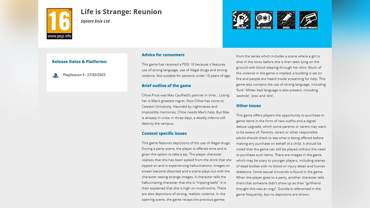 На официальном сайте рейтингового агентства PEGI засветилась неанонсированная Life is Strange: Reunion. На странице игры можно найти дату выхода (неверную) и описание сюжета.
