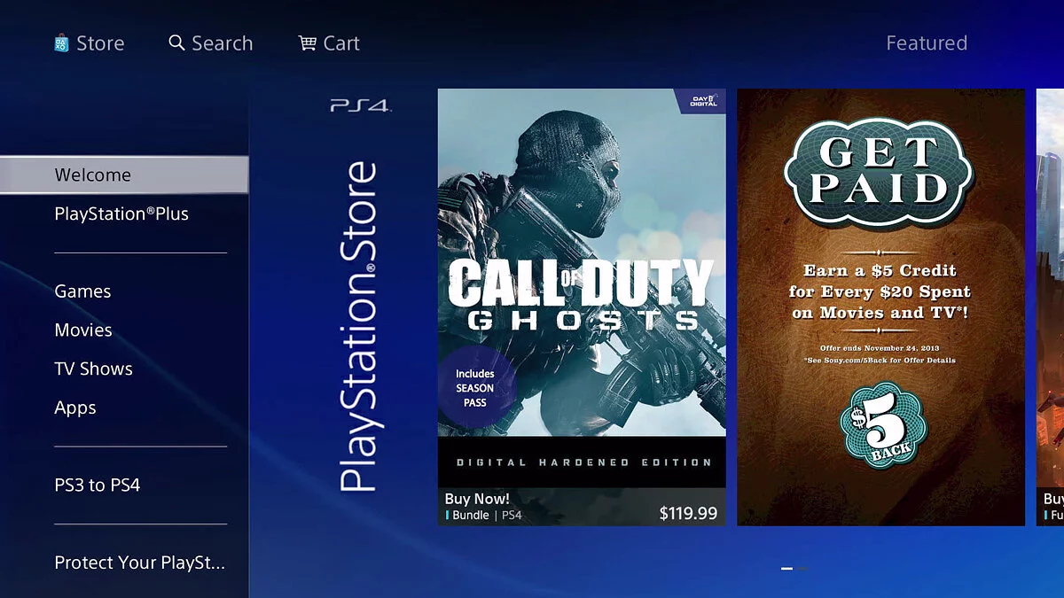 Слева находится знакомое любителям консолей Sony меню с выбором десятков игр (где можно найти цифровые релизы, инди, дополнения, популярные, с функцией Cross-buy и прочие), фильмов, приложений и ТВ-программ, которые в свою очередь поделены на популярные, новинки, горячие предложения и т.д.