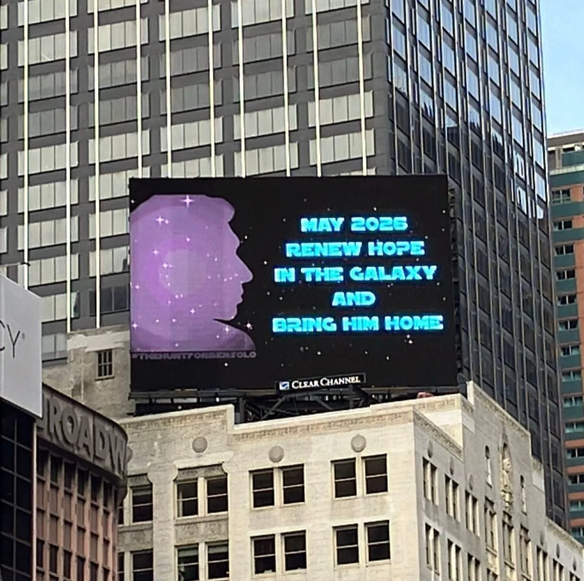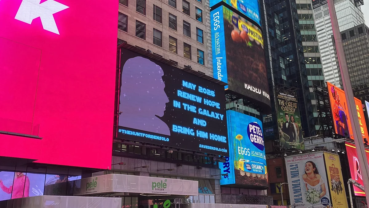 В прошлом году весь Лос-Анджелес был обклеен плакатами с надписью «Бен Соло пропал без вести». Их перевели на 11 языков, чтобы фанаты со всего мира увидели поддержку. Теперь автор той акции — Брианна Джонс (Brianna Johns) — пошла дальше и заплатила за установку двух билбордов на Таймс-сквер в Нью-Йорке. Один из щитов появился недалеко от магазина Disney.
