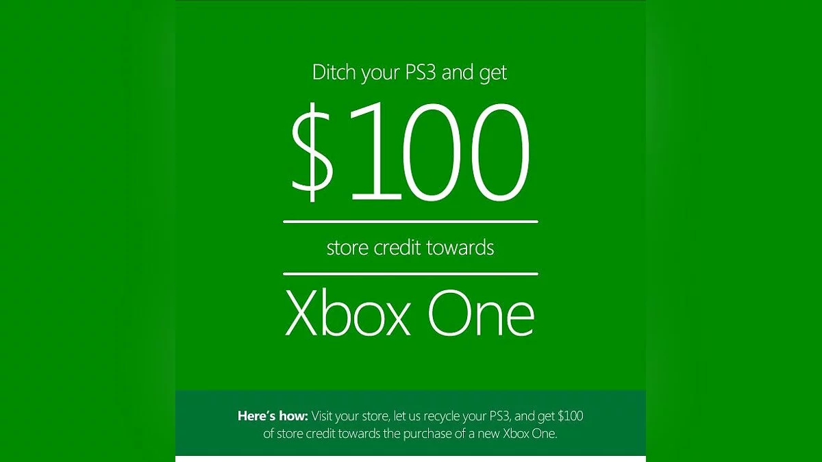 Компания Microsoft предлагает 100 $ на покупки в своем магазине за принесенную консоль прошлого поколения. В акции участвуют PS3 и Xbox 360. Маленьким шрифтом уточняется, что консоль должна быть полностью рабочей и в полной комплектации.