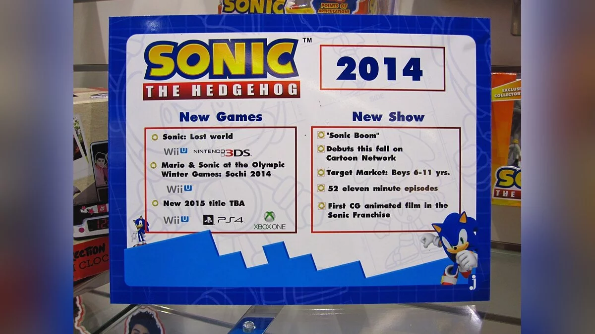 На своей табличке они написали все крупные игры про Соника, которые появятся в продаже в обозримом будущем: Sonic: Lost World для Wii U и 3DS (2013 год), Mario & Sonic at the Sochi 2014 Olympic Winter Games для Wii U (2013 год) и, наконец, так интересующая нас неанонсированная игра, которая поступит в продажу на PS4, Xbox One и Wii U в 2015 году. Заметьте, что на табличке отсутствуют приставки ушедшего поколения — по-видимому, Соник окончательно перебрался на новые консоли.