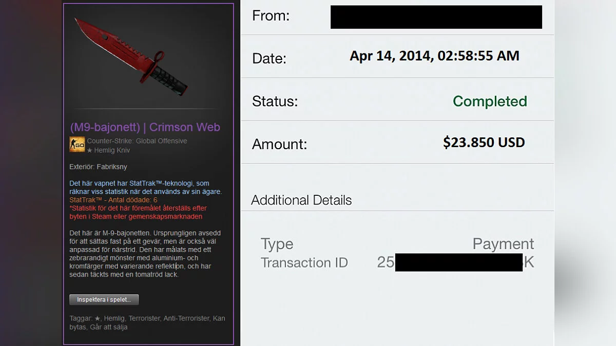 Этот нож Stattrak M9 Bayonet (Crimson Web) первый в мире, поэтому и стоит немалые деньги. Не последнюю роль в этом играет и тот факт, что нож отслеживает, сколько человек вы зарезали в игре с его помощью. Но всё же изначальная цена была меньше той, за которую в конечном итоге ушло оружие. Продавец, организовавший аукцион, установил начальную цену в 4 500 $. Предложения росли, росли... пока не достигли 23 850 $. Пишут, что счастливый продавец до сих пор не может прийти в себя.