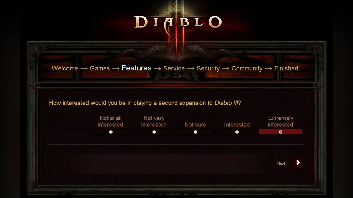 На данном скриншоте представители разработчика пытаются выяснить, насколько пользователи заинтересованы во втором аддоне для Diablo 3. Предлагается выбрать от «вовсе не заинтересован» до «Очень заинтересован». Остальная часть опроса посвящена выяснению того, насколько каждый конкретный игрок удовлетворен игровым процессом и другими аспектами Diablo 3 и первого аддона Diablo 3: Reaper of Souls.